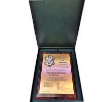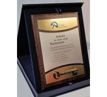 Dyplom drewniany złożony na lakierowanym podkładzie - podziękowanie od straży pożarnej.