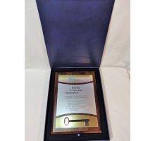 Dyplom jest wykonany na lakierowanym drewnianym podkładzie i składa się z kilku elementów: