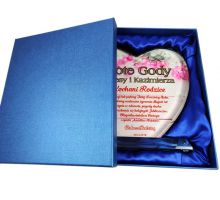 Pamiątkowa dedykacja wygrawerowana jest laminacie grawerskim, na którym dodatkowo umieszczony jest srebrny obrazek.