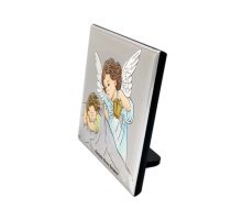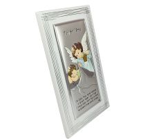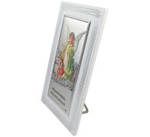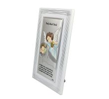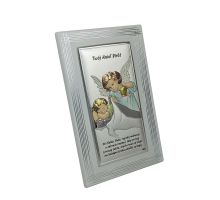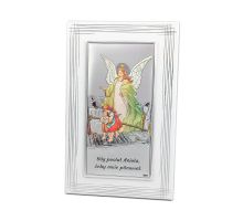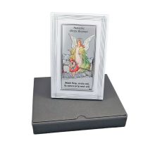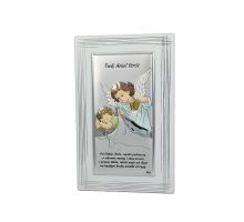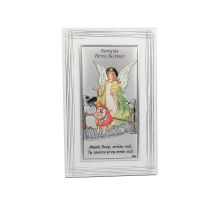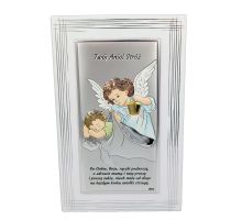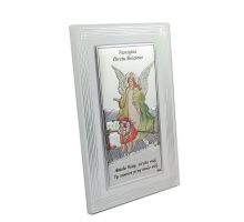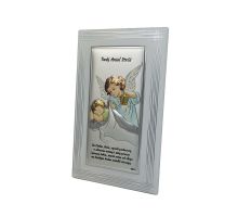 Anioł Stróż z latarenką nad dzieckiem - kolorowy srebrny obrazek DS02F/C z modlitwą na białym drewnie