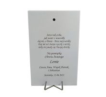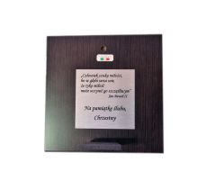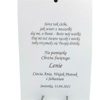 Aniołek z latarenką w sercu na białym drewnie z podpisem Pamiątka Chrztu Świętego - srebrny obrazek 6449W