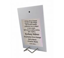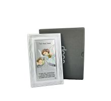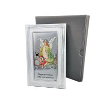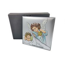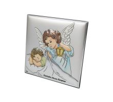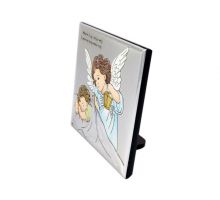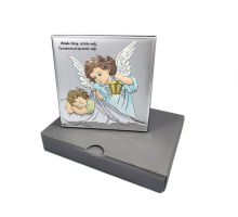 Aniołek z latarenką nad dzieckiem w kwadracie z podpisem - srebrny obrazek kolorowy DS14/C