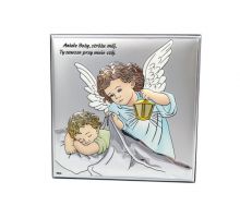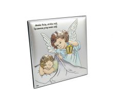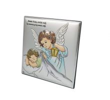 Aniołek z latarenką nad dzieckiem w kwadracie z modlitwą - srebrny obrazek DS15/C kolorowy