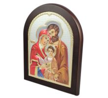 Obrazek z wizerunkiem Św. Rodziny ma prostokątny kształt i umieszczony jest na białym drewnie.
