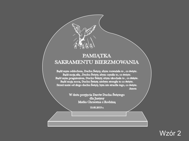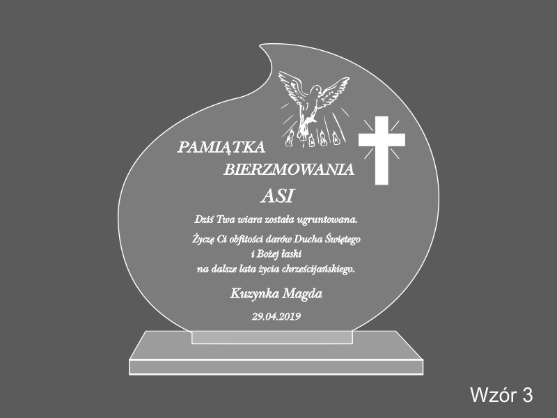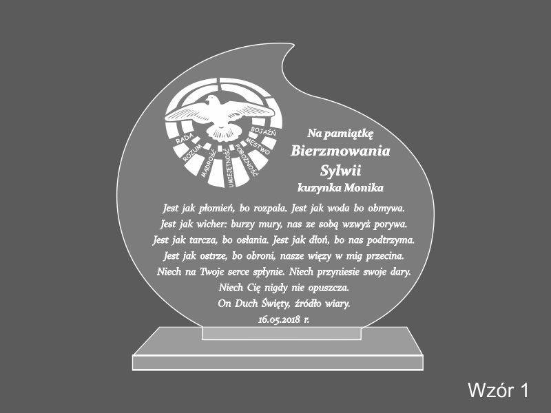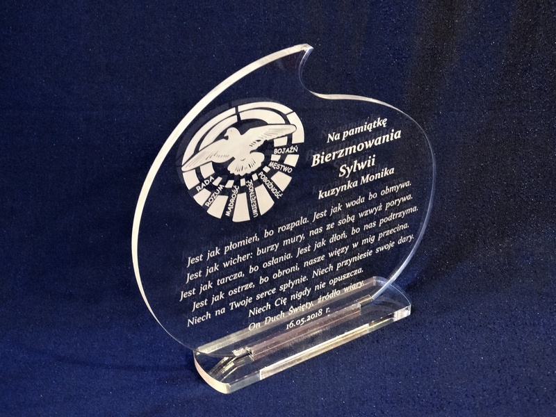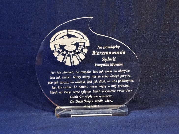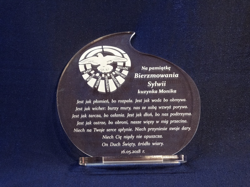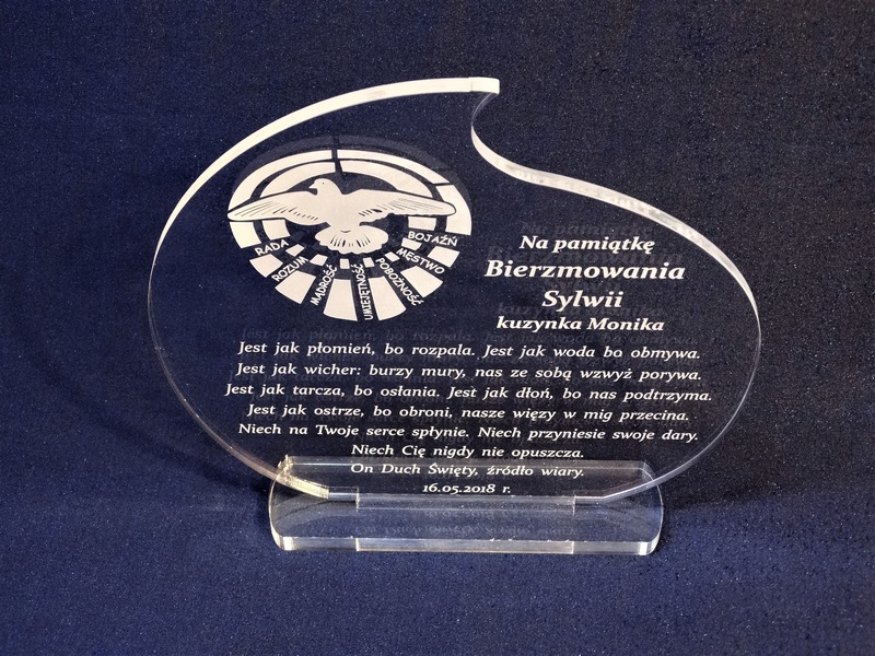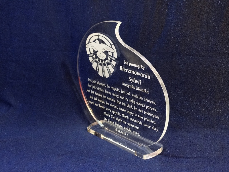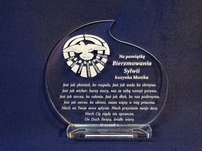 Pamiątkowa statuetka na pamiątkę przyjęcia Sakramentu Bierzmowania wykonana z bezbarwnej pleksi, z grawerem.
