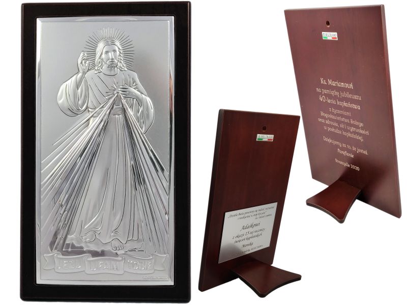 Pamiątka jubileuszu święceń kapłańskich w postaci srebrnego obrazka z Jezu ufam Tobie z grawerem.