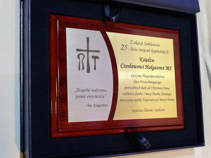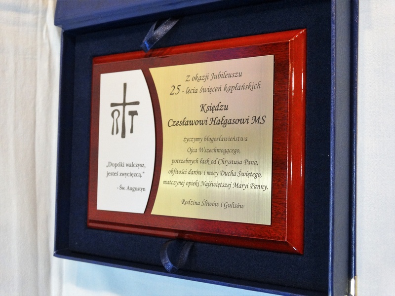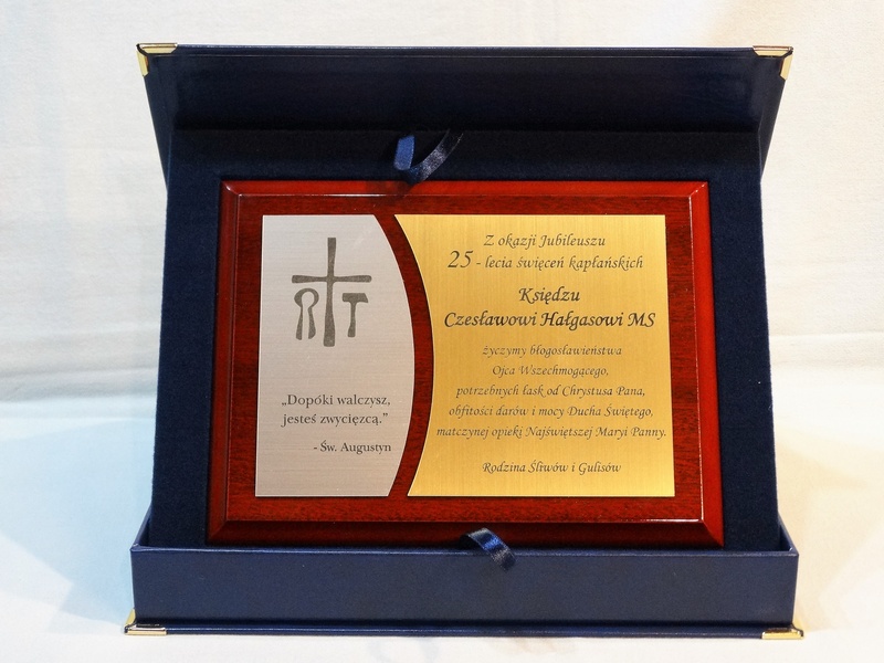 Pamiątkowy upominek z okazji jubileuszu święceń kapłańskich w postaci okolicznościowego złożonego dyplomu drewnianego.
