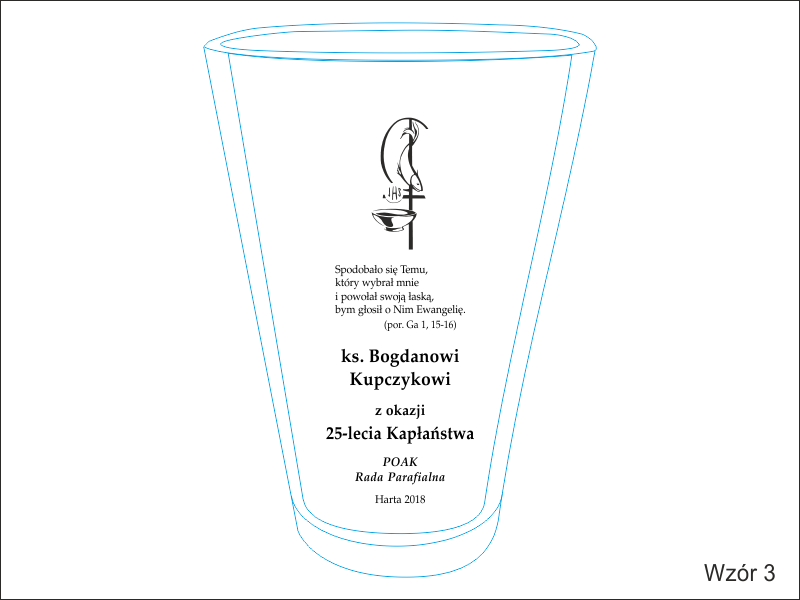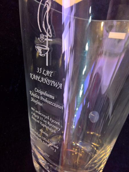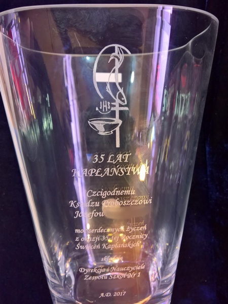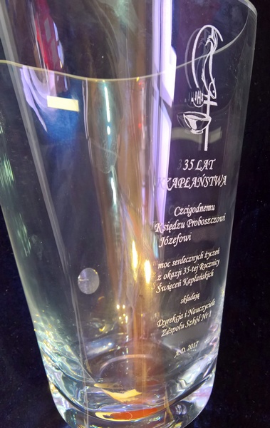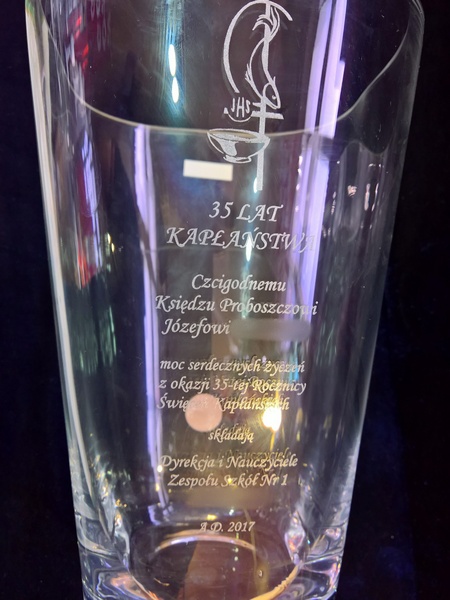 Na wazonie wykonany jest grawer ozdobnych grafik i dedykacji na pamiątkę jubileuszu kapłaństwa.