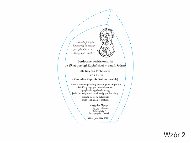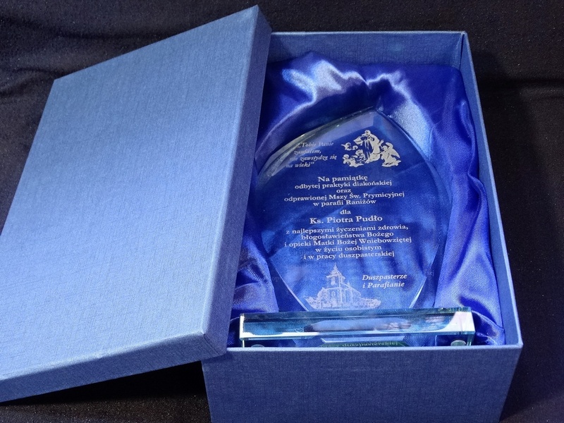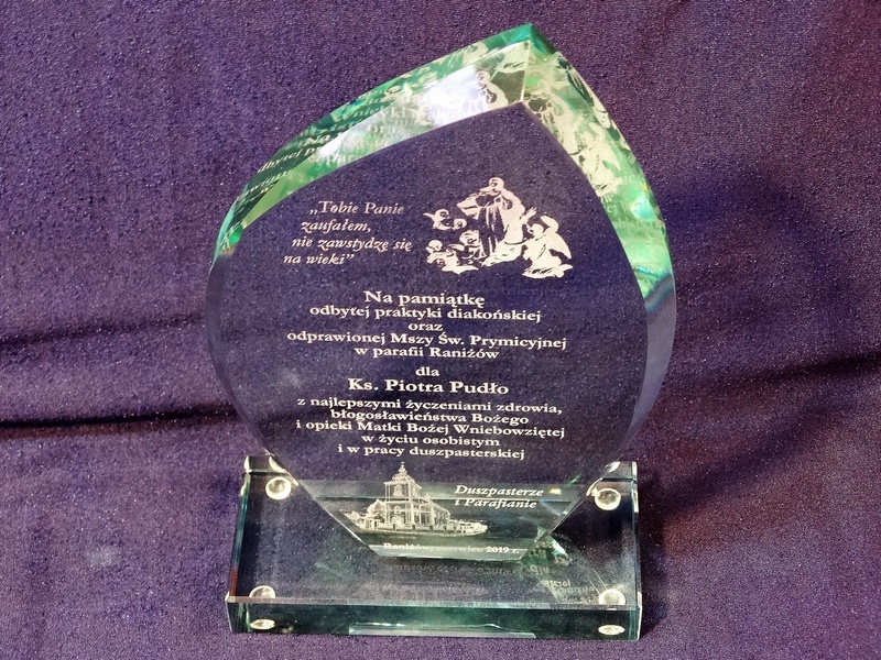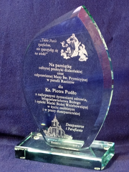 Pamiątkę z grawerem na jubileusz kapłaństwa można także wykonać na innych modelach statuetek szklanych.