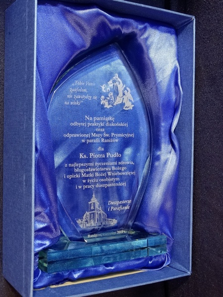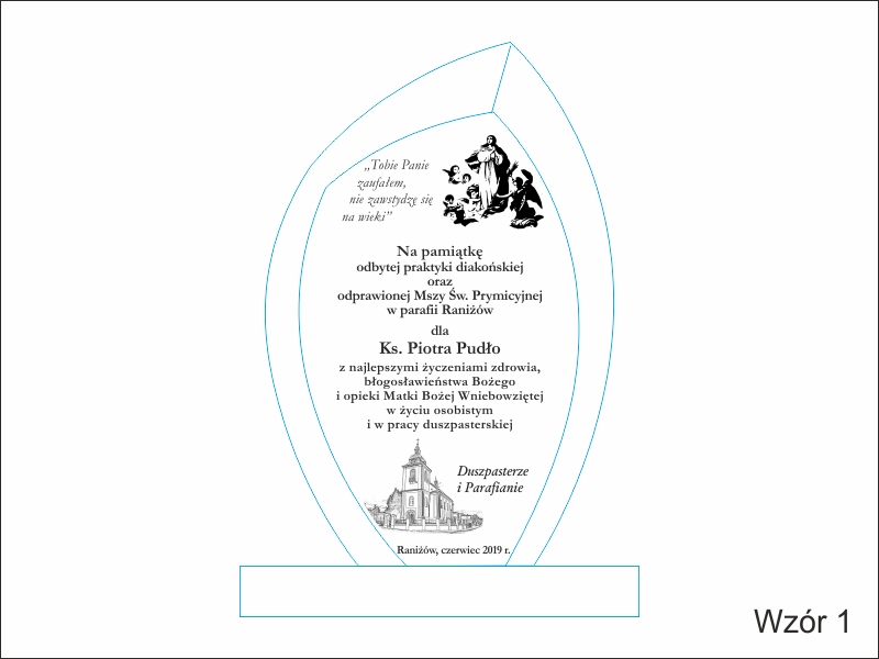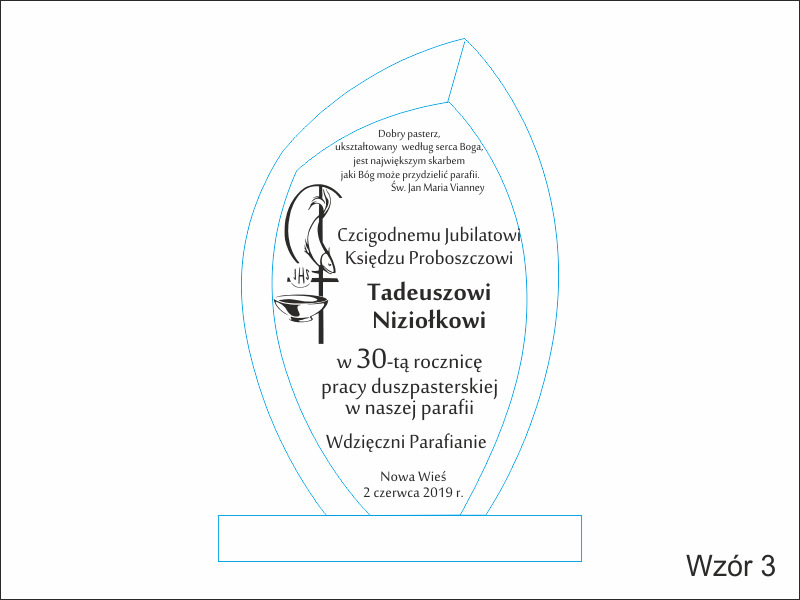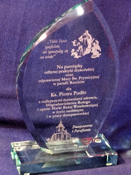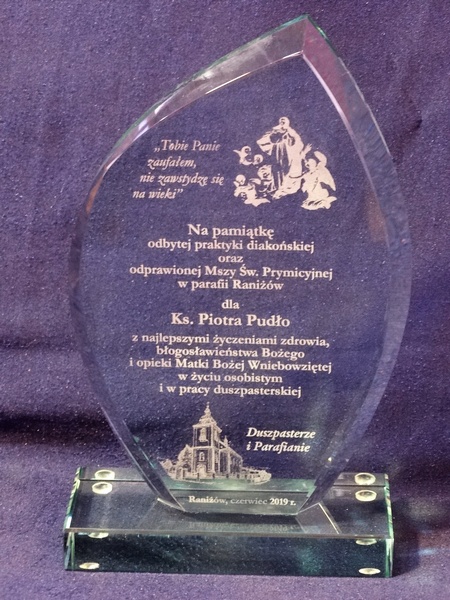 Na statuetce wykonany jest grawer ozdobnych grafik i dedykacji na pamiątkę dla księdza.