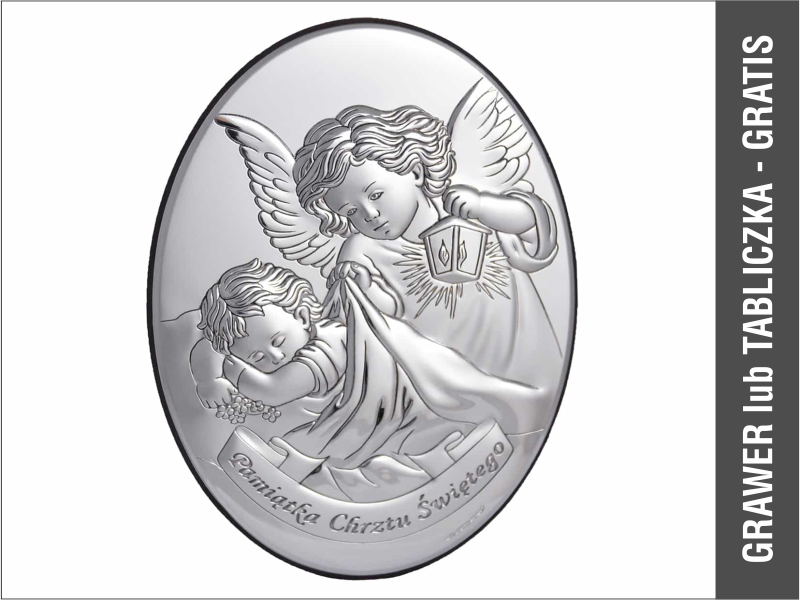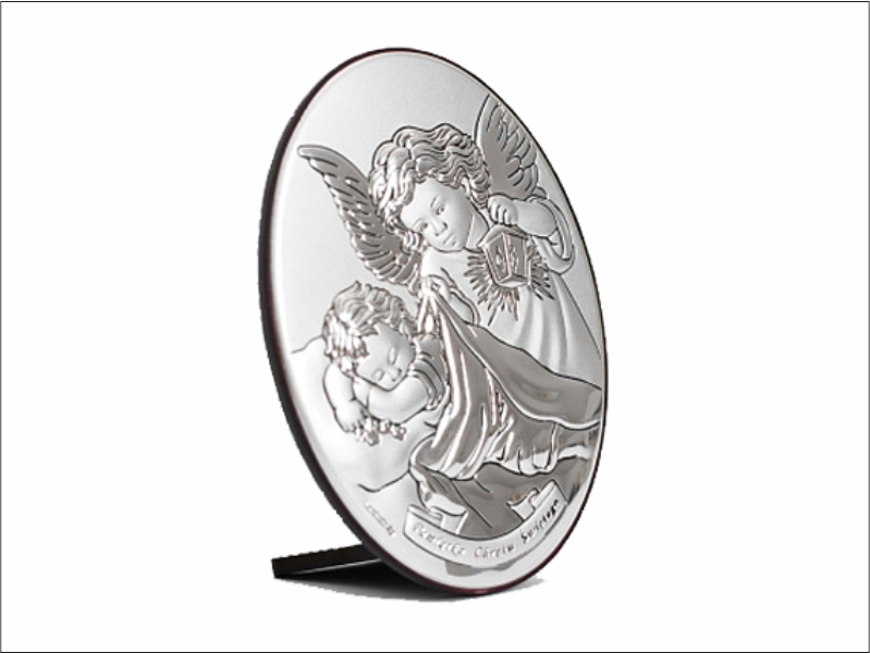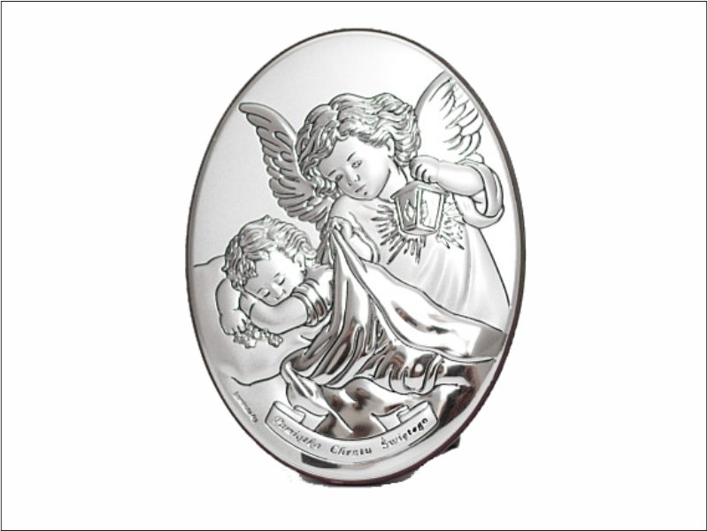 Srebrny Obrazek "Aniołek z latarenką nad dzieckiem z napisem 6353 owalny".