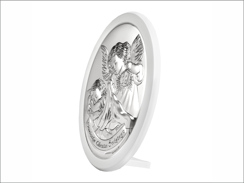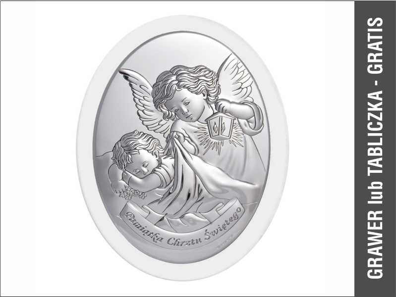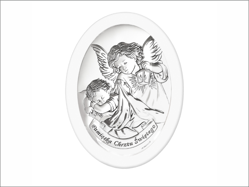 Srebrny Obrazek "Aniołek z latarenką nad dzieckiem na białym drewnie z napisem 6353W owalny".