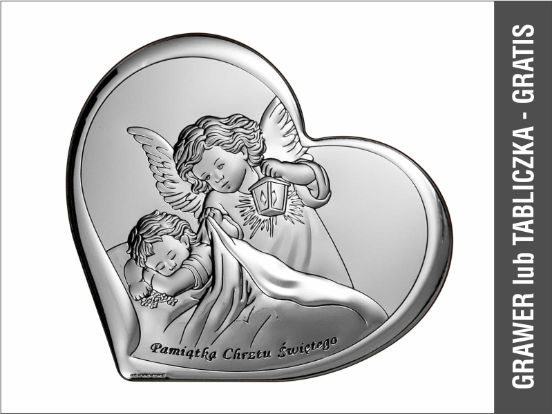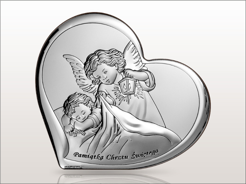 Obrazek ma kształt serca, a w dolnej części wytłoczony jest podpis "Pamiątka Chrztu Świętego".