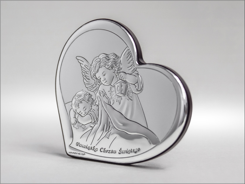 - obrazek srebrny w kształcie serca przedstawiający Aniołka z latarenką