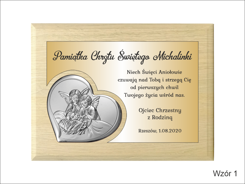Dedykacja z okazji chrztu jest wygrawerowana w złotym laminacie, w którym wycięte jest także miejsce na srebrny obrazek.