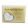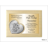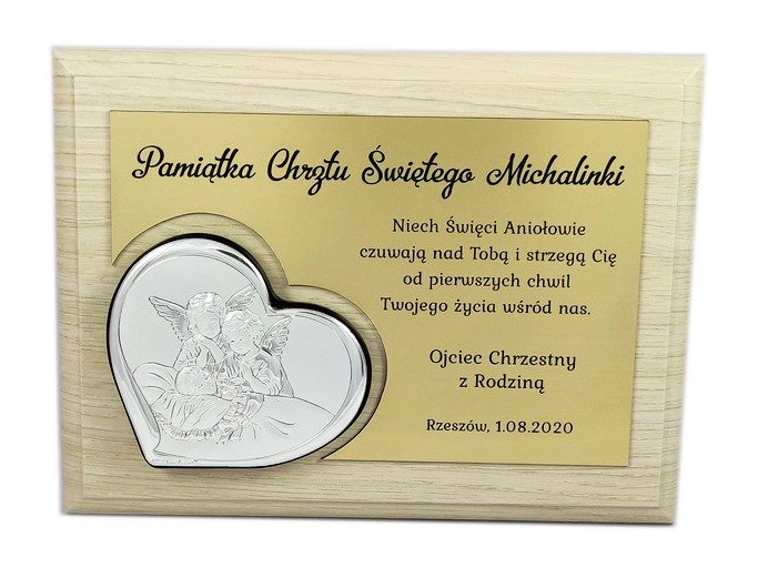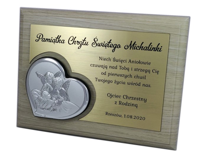 Pamiątka Chrztu Świętego i zarazem wyjątkowy upominek - srebrny obrazek z aniołkami w sercu na jasnym drewnianym podkładzie i złotą tabliczką.