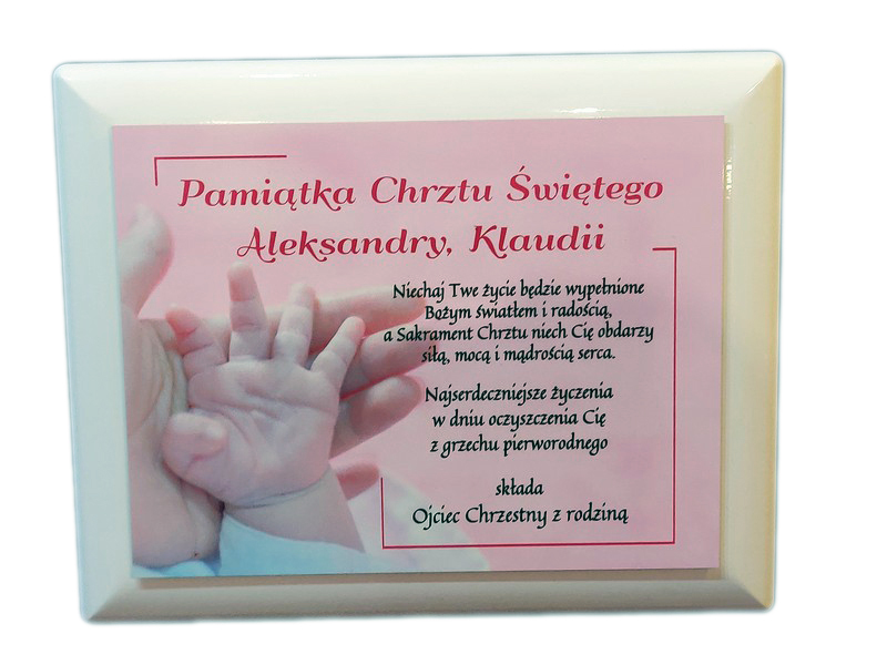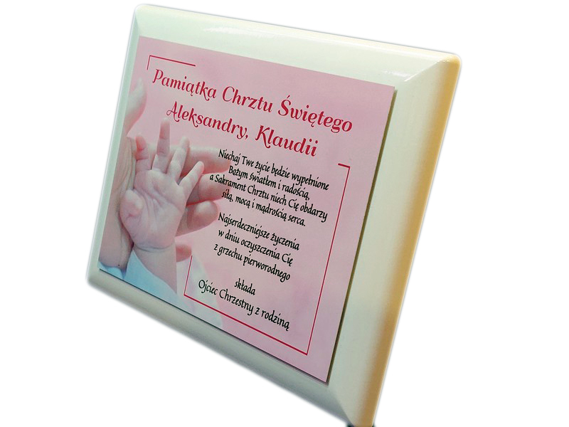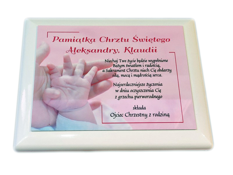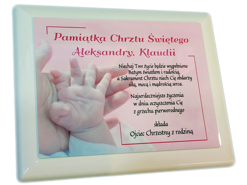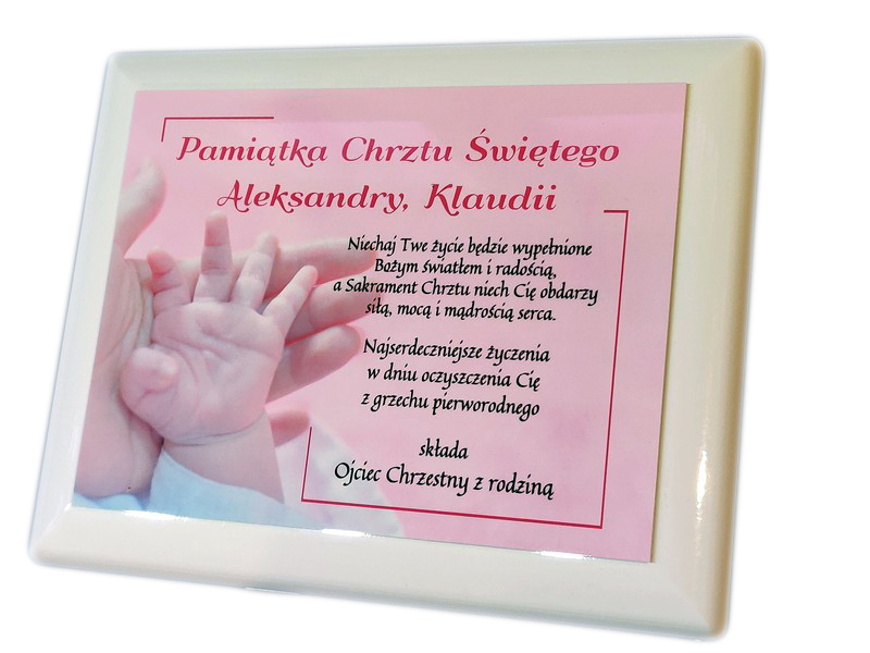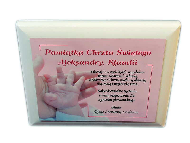 Upominek z okazji Chrztu Świętego w postaci dyplomu okolicznościowego z nadrukiem na białym drewnianym podkładzie.