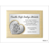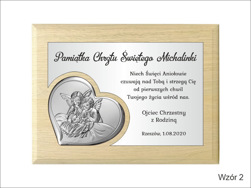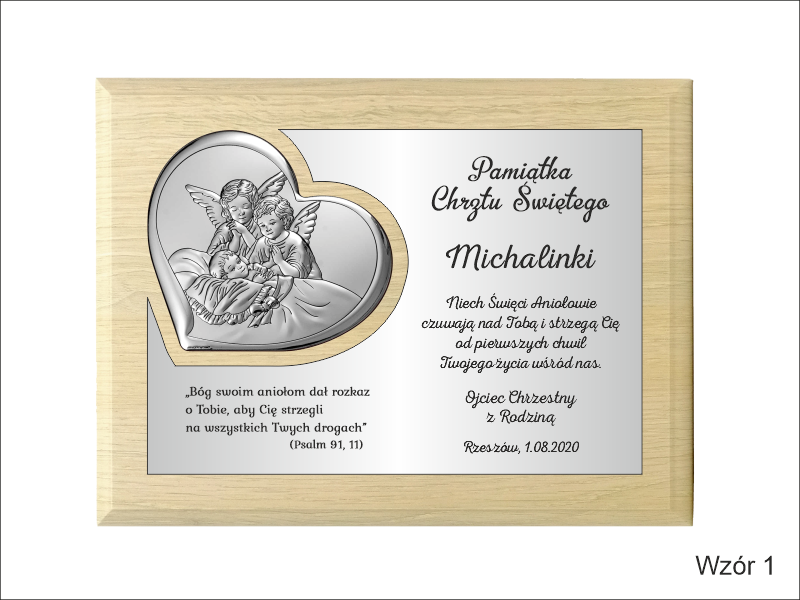 Pamiątka Chrztu Świętego i zarazem wyjątkowy upominek - srebrny obrazek z aniołkami w sercu na jasnym drewnianym podkładzie i srebrną tabliczką.