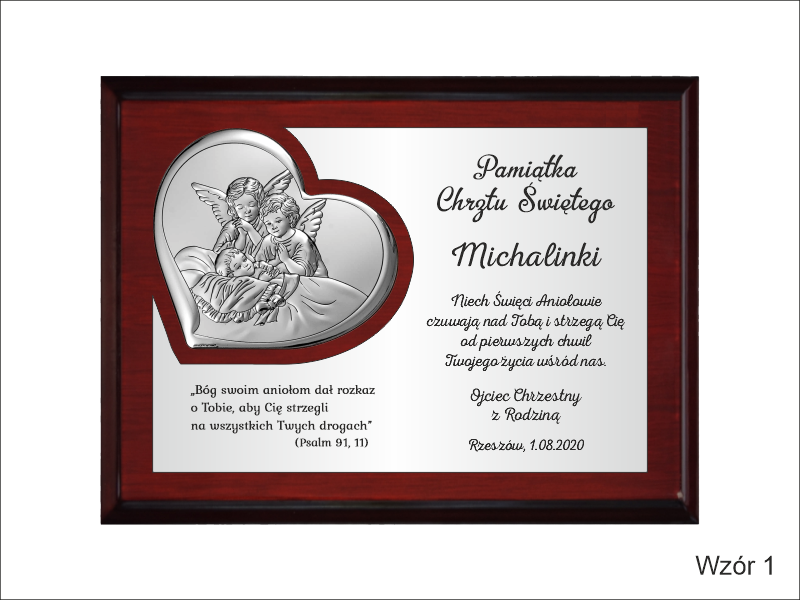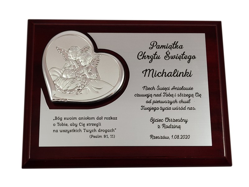 - ze srebrnego laminatu z wygrawerowaną dedykacją i wyciętym miejscem na obrazek,