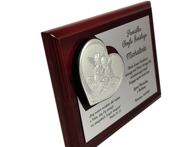 Dedykacja jest wygrawerowana w srebrnym laminacie, w którym wycięte jest także miejsce na srebrny obrazek.