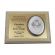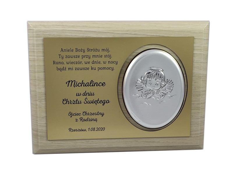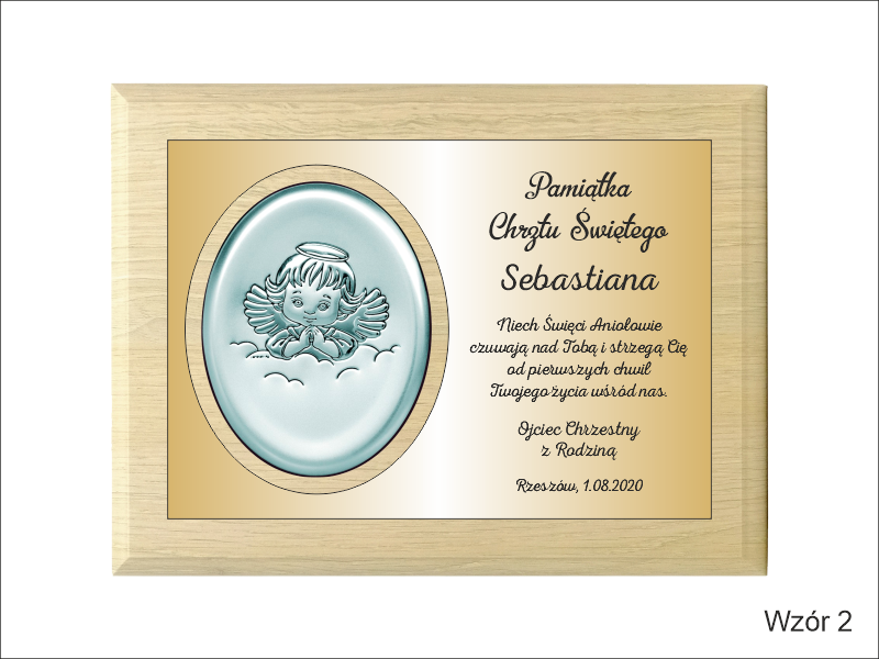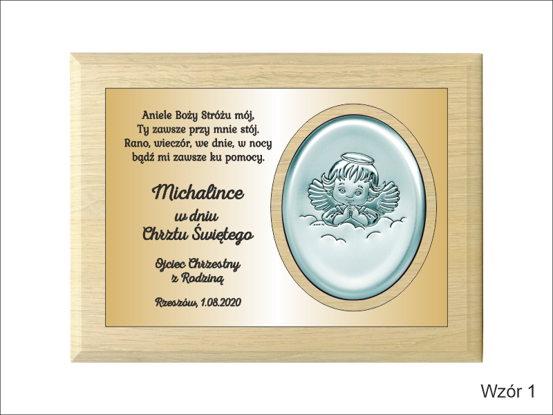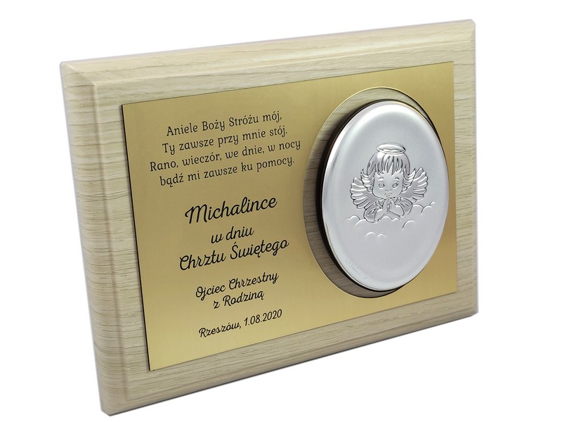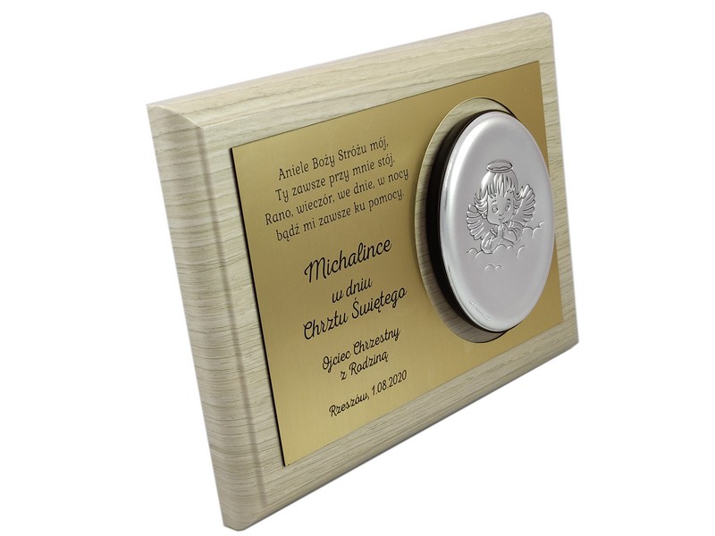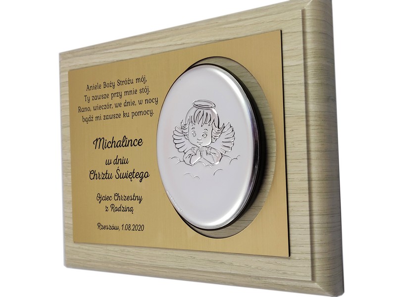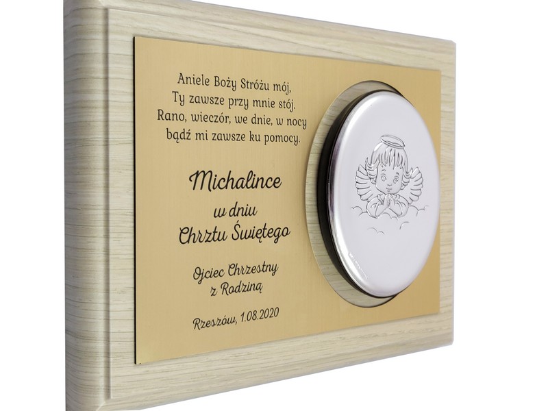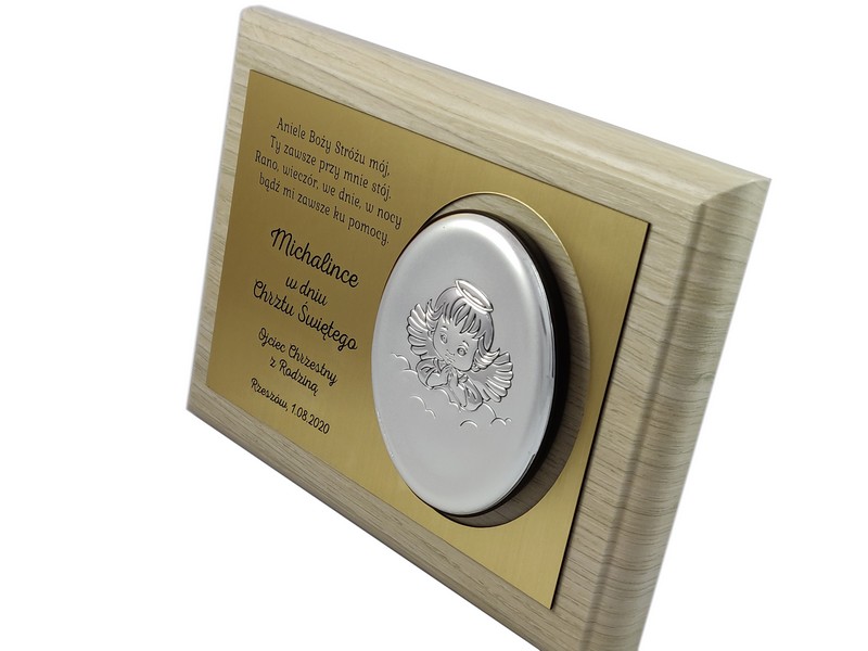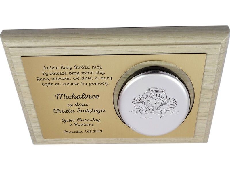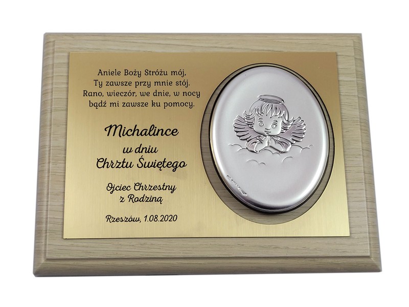 Dedykacja jest wygrawerowana w złotym laminacie, w którym wycięte jest także miejsce na srebrny obrazek.