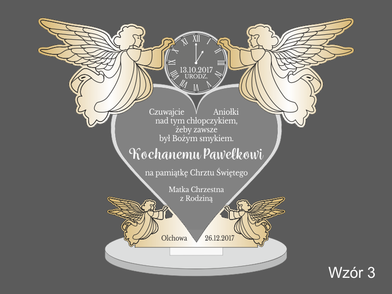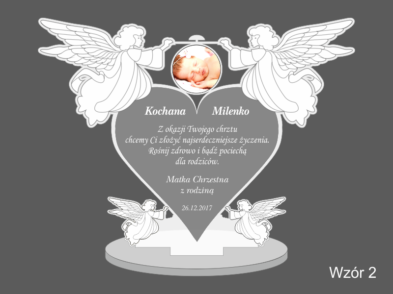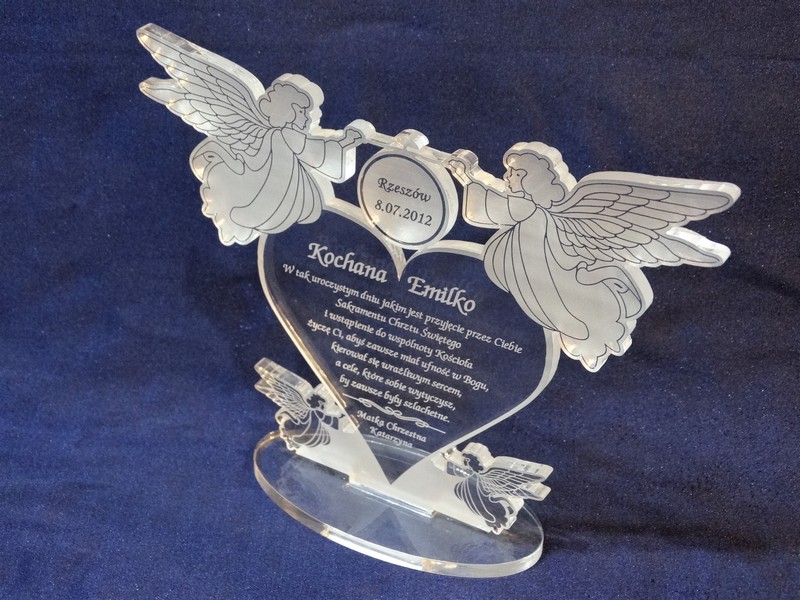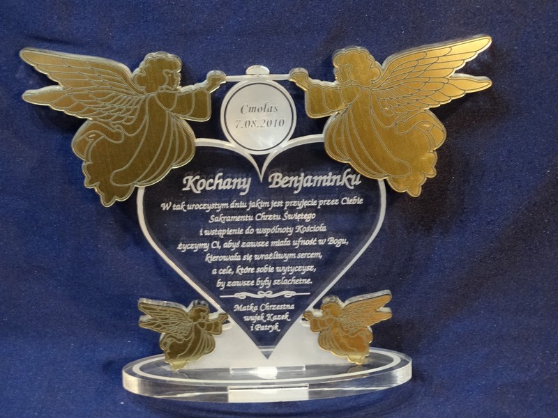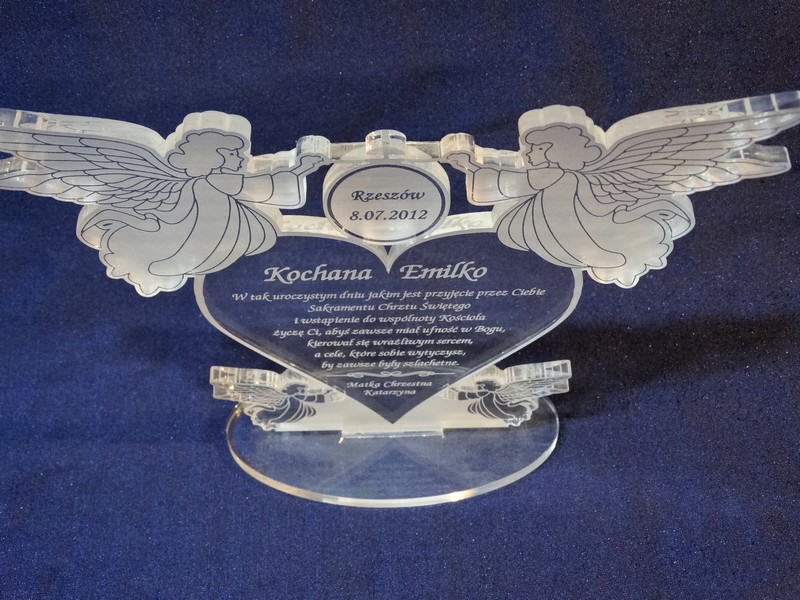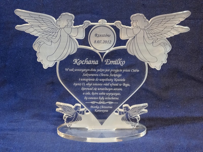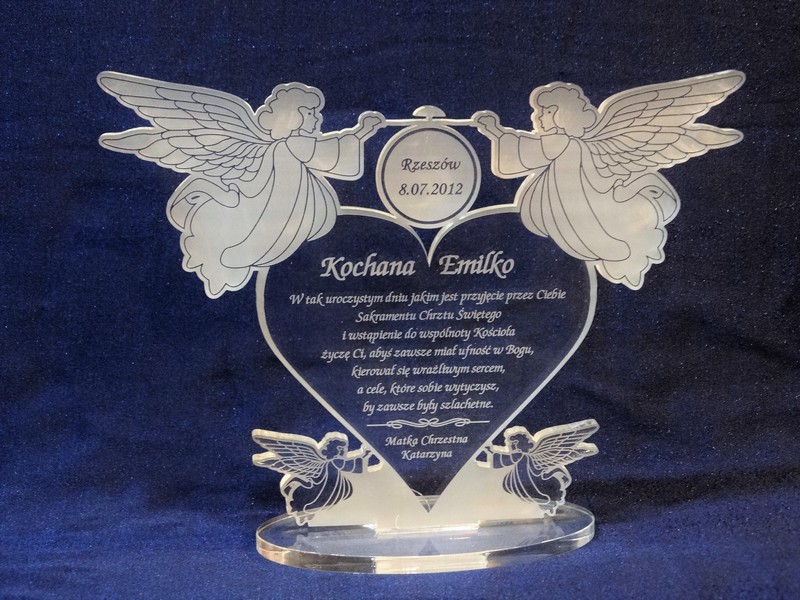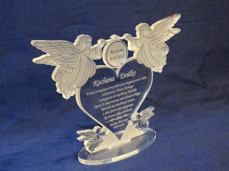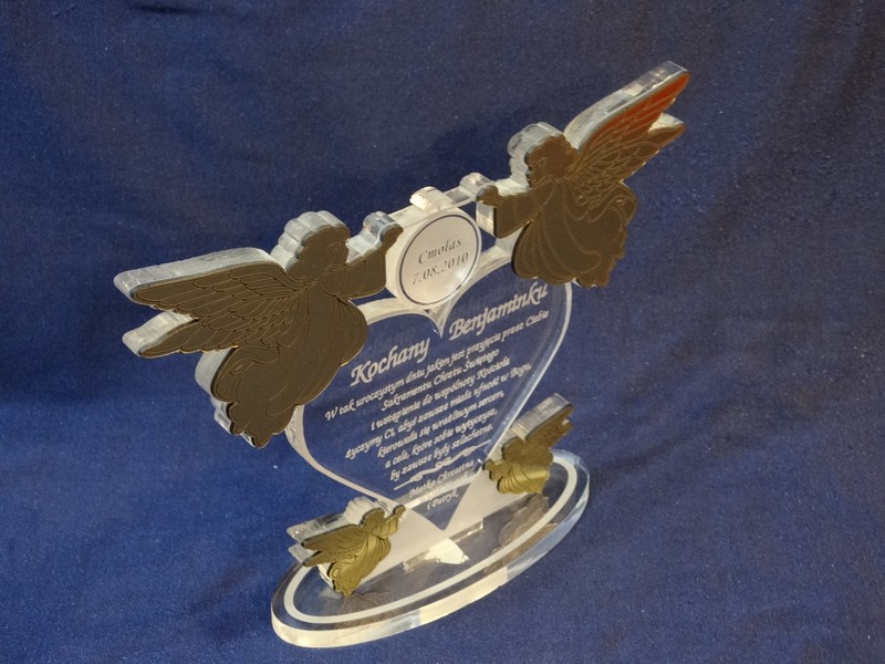 Statuetka z pleksi bezbarwnej z grawerem dedykacji i ozdobnych grafik z okazji Chrztu Świętego z motywem "Aniołków".