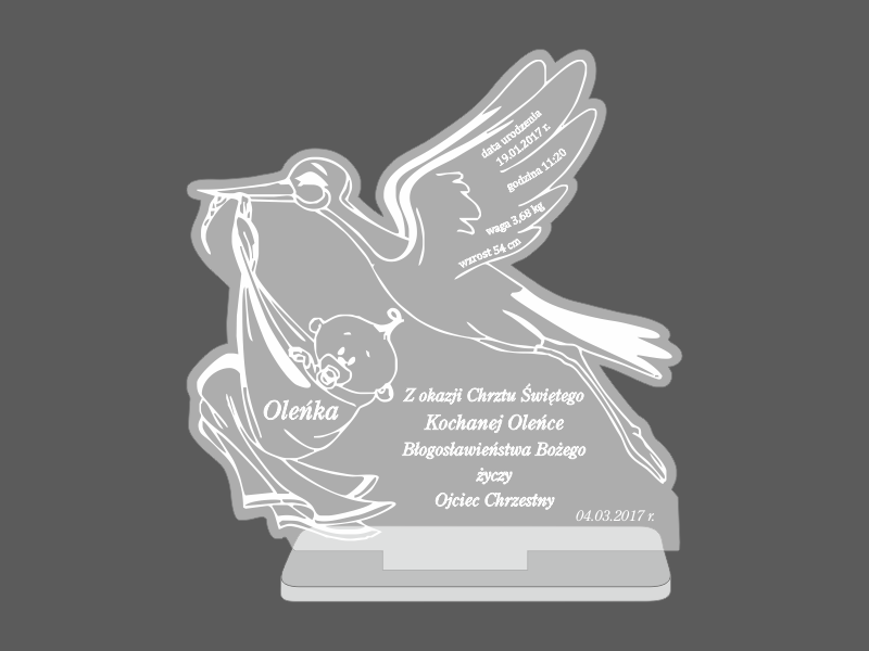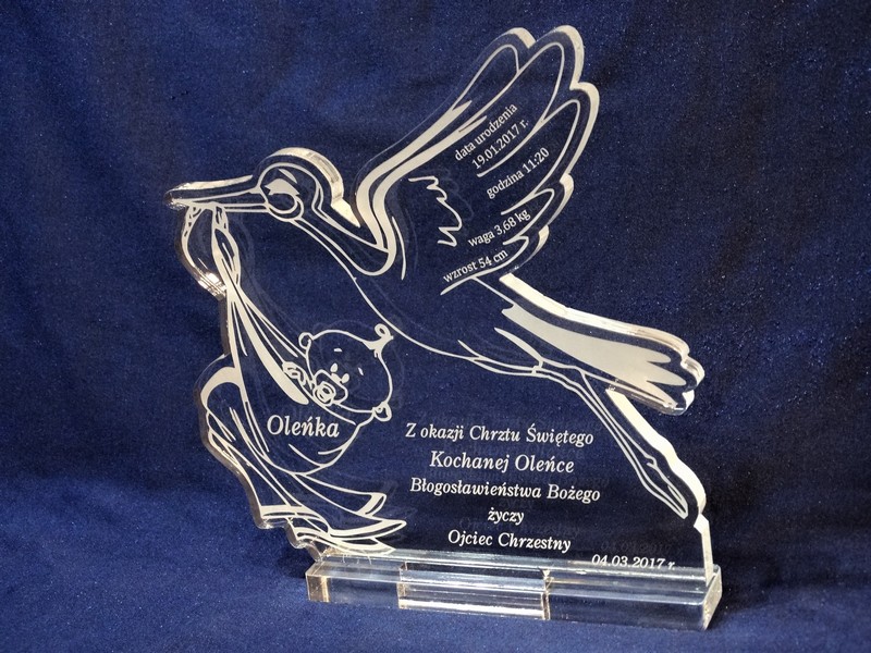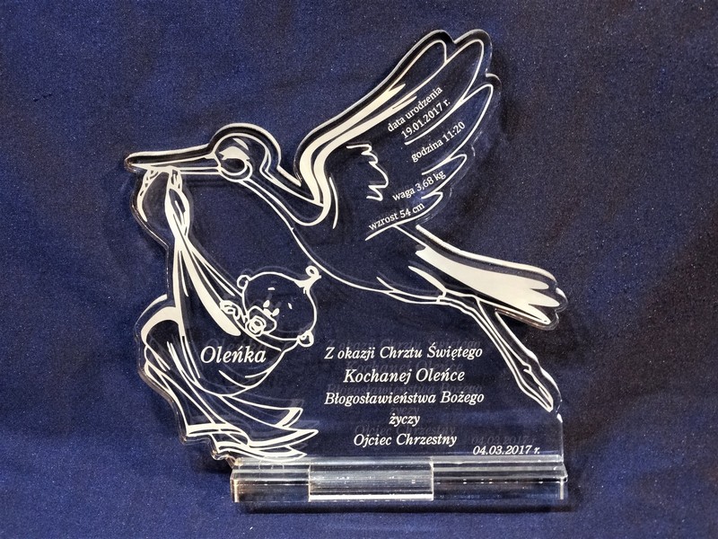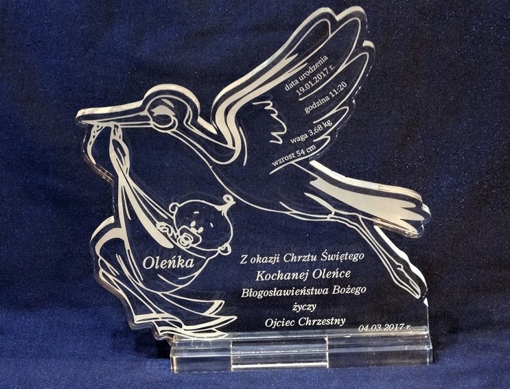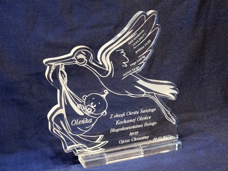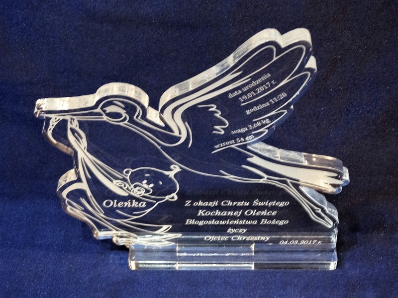 Statuetka z pleksi bezbarwnej z grawerem dedykacji i ozdobnych grafik z okazji Chrztu Świętego w kształcie "Bociana".