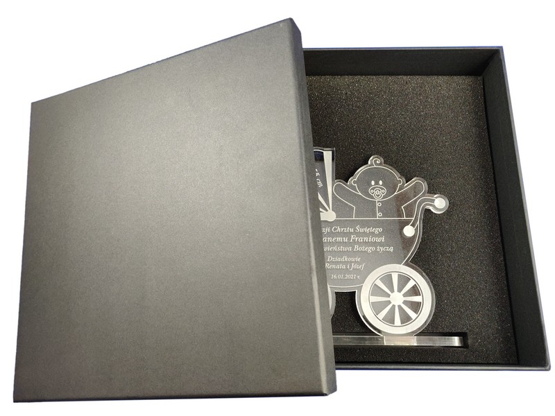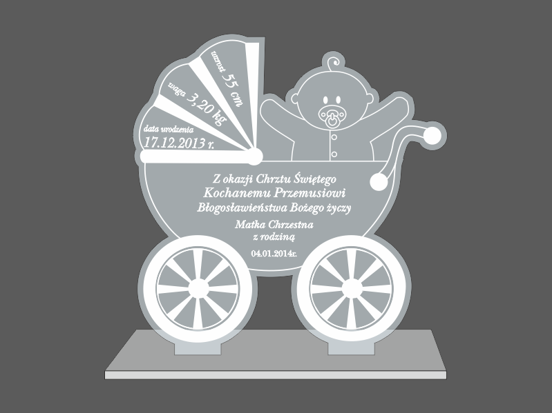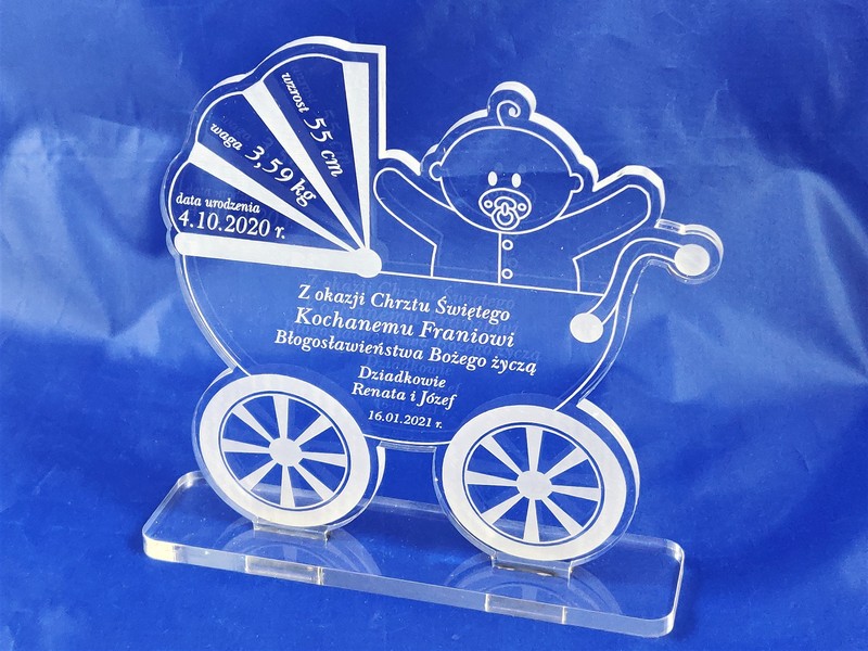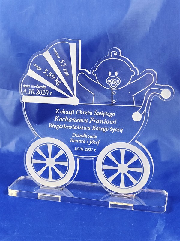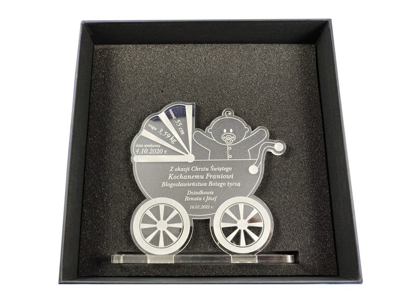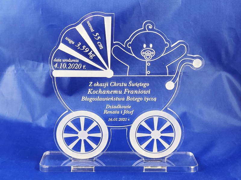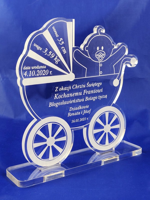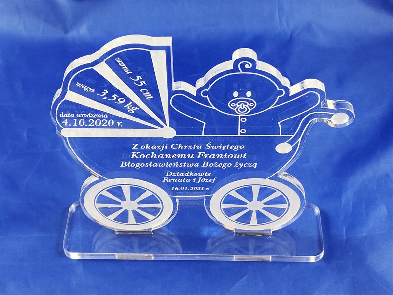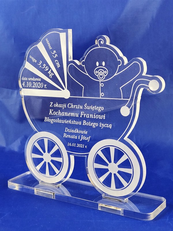 Pamiątka Chrztu Świętego w postaci statuetki z pleksy w kształcie "Wózka" z grawerem dedykacji.