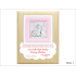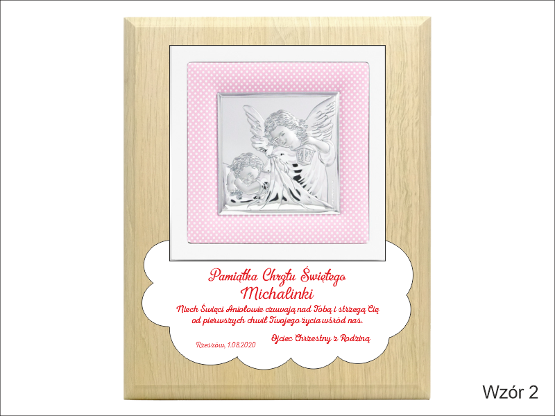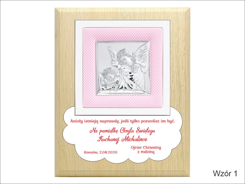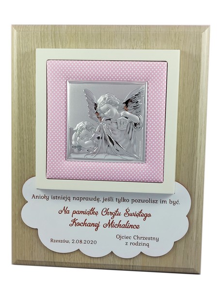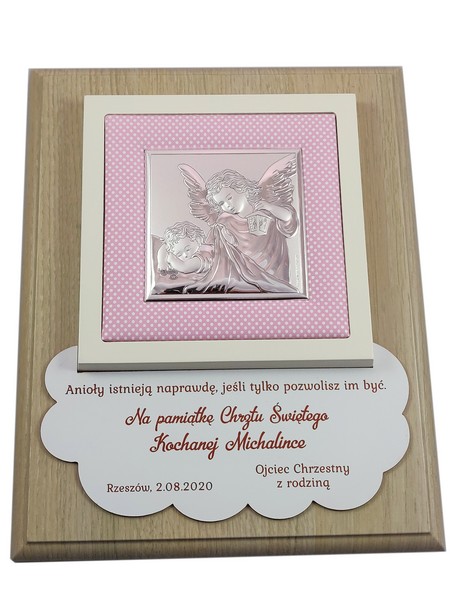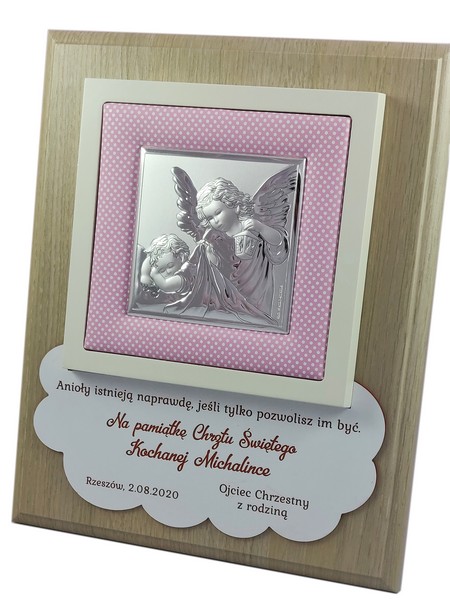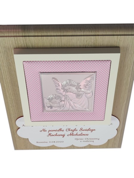 Upominek ma postać srebrnego obrazka z aniołkiem na różowym materiale oraz białego grawerowanego laminatu umieszczonych na lakierowanym jasnym podkładzie drewnianym.