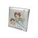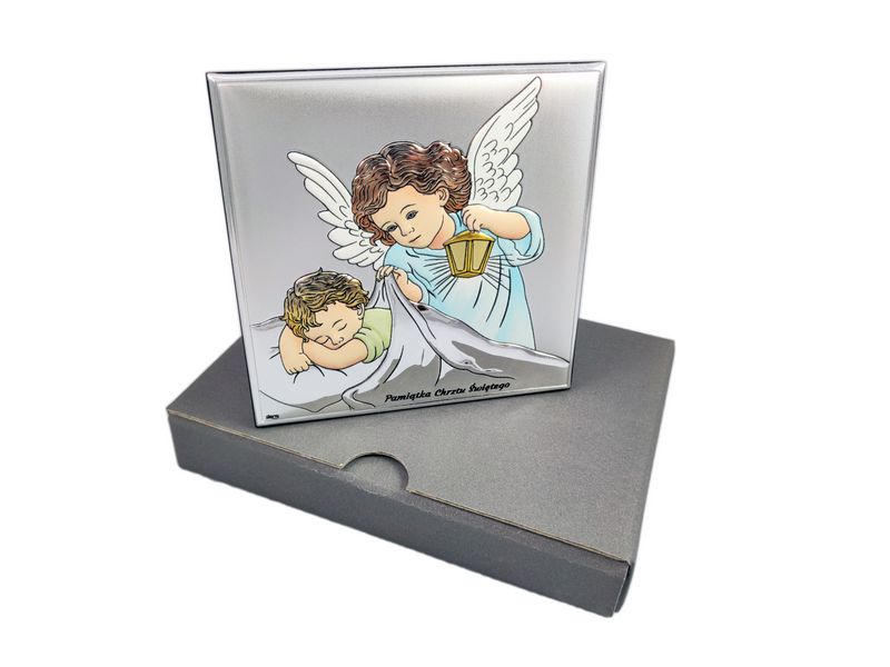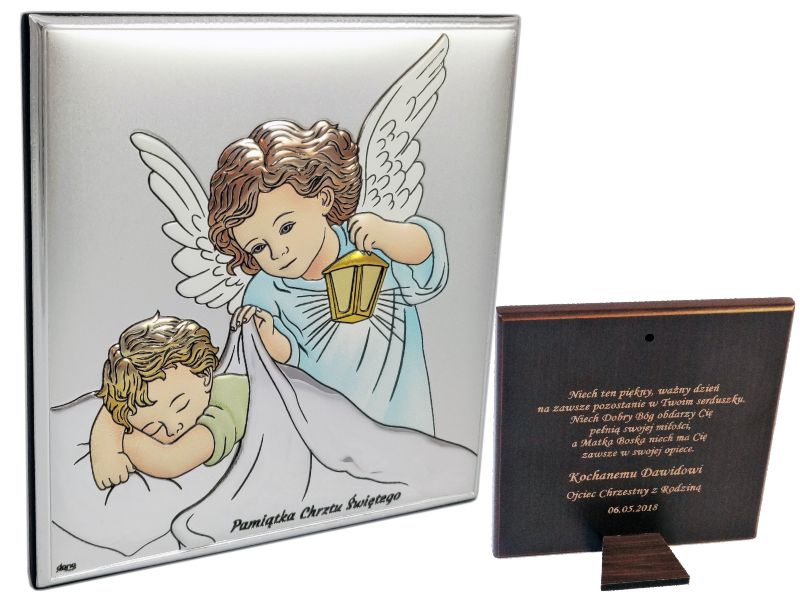 Pamiątka Chrztu Świętego w postaci kolorowego srebrnego obrazka z Aniołkiem w kwadratowym kształcie z grawerem.