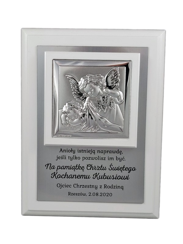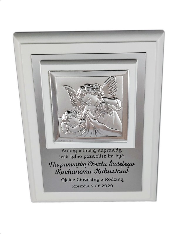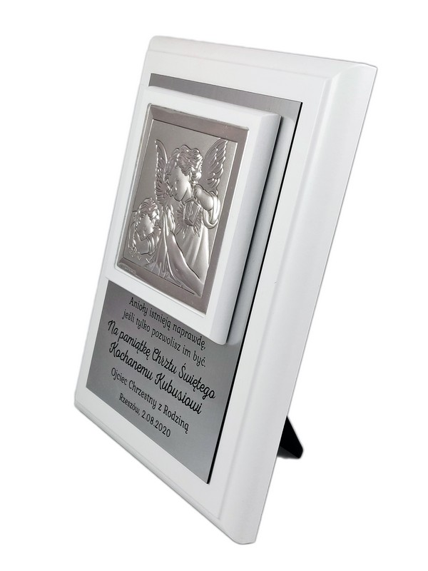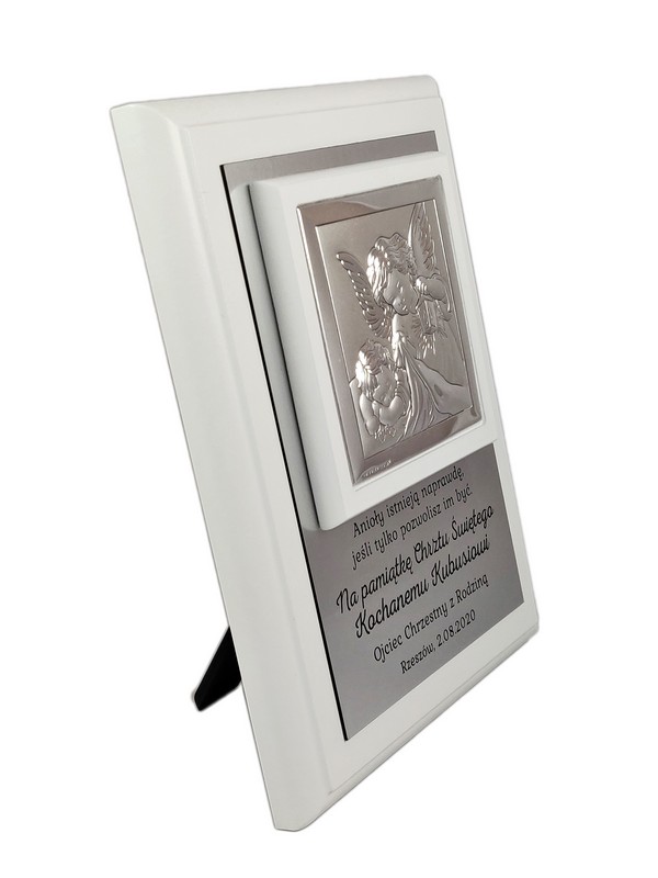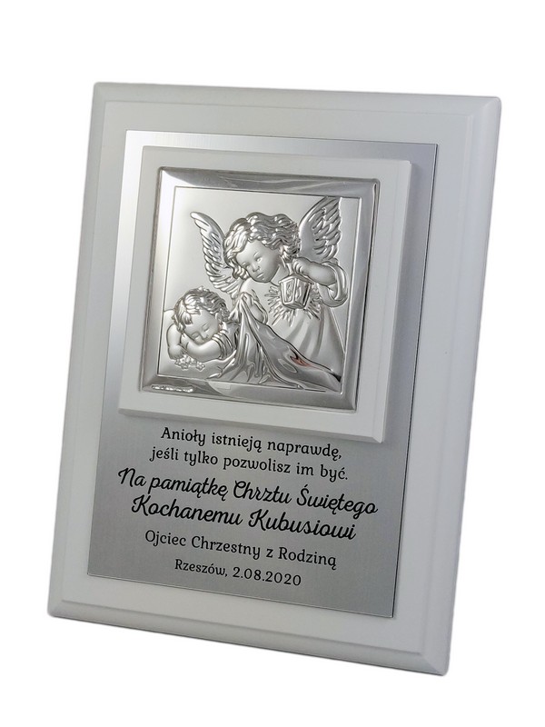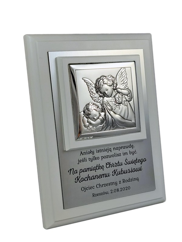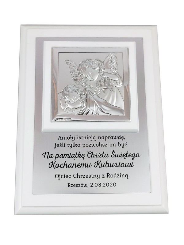 - ze srebrnego obrazka z wizerunkiem aniołka nad dzieckiem na białym drewnie