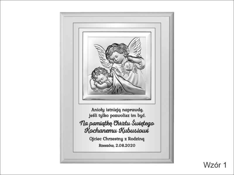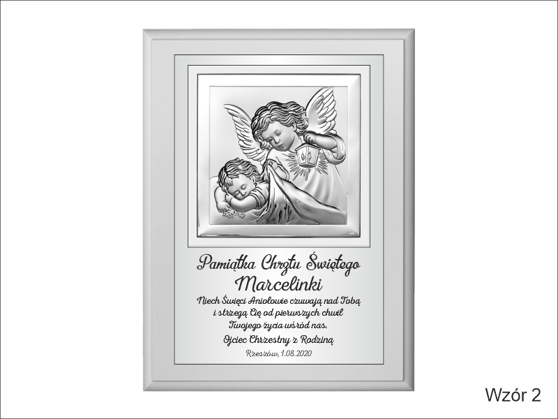 Dedykacja jest wygrawerowana w srebrnym laminacie, do którego przymocowany jest także srebrny obrazek.