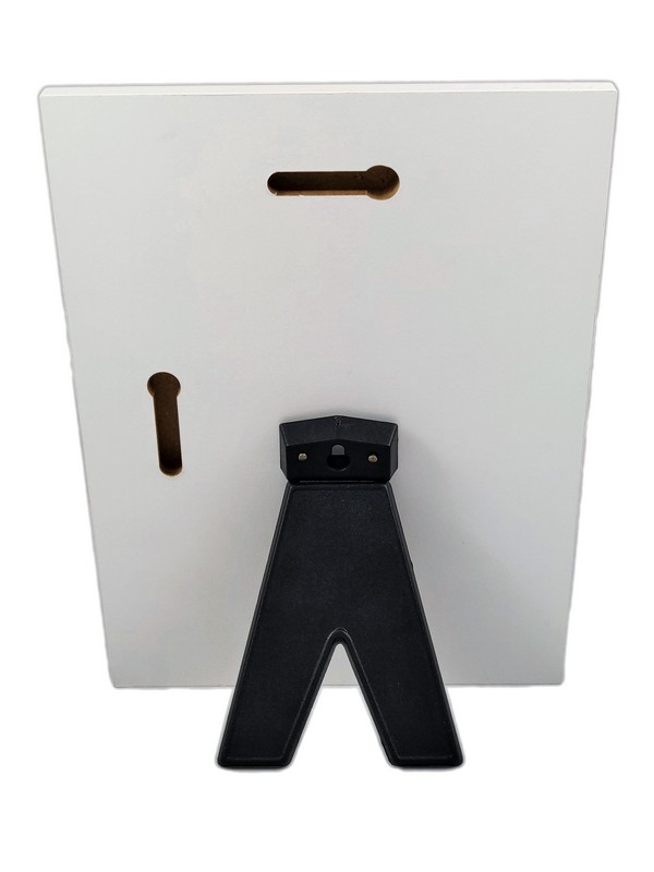 Obrazek wraz z lamiantem przymocowany jest do eleganckiego białego podkładu drewnianego.
