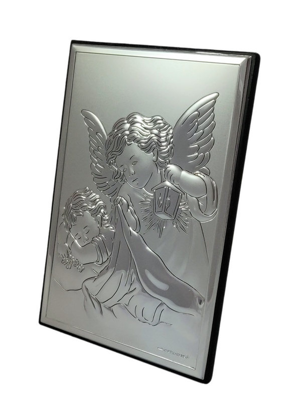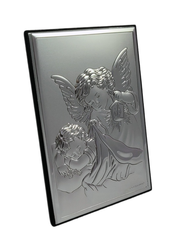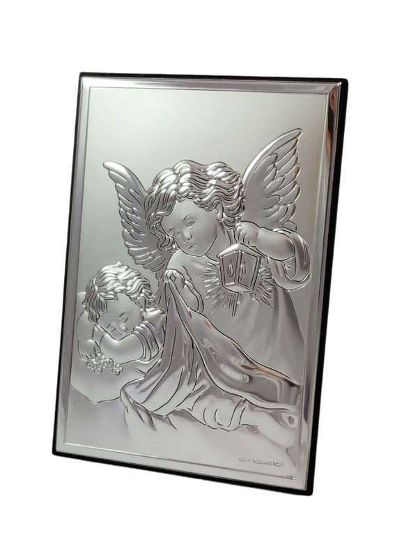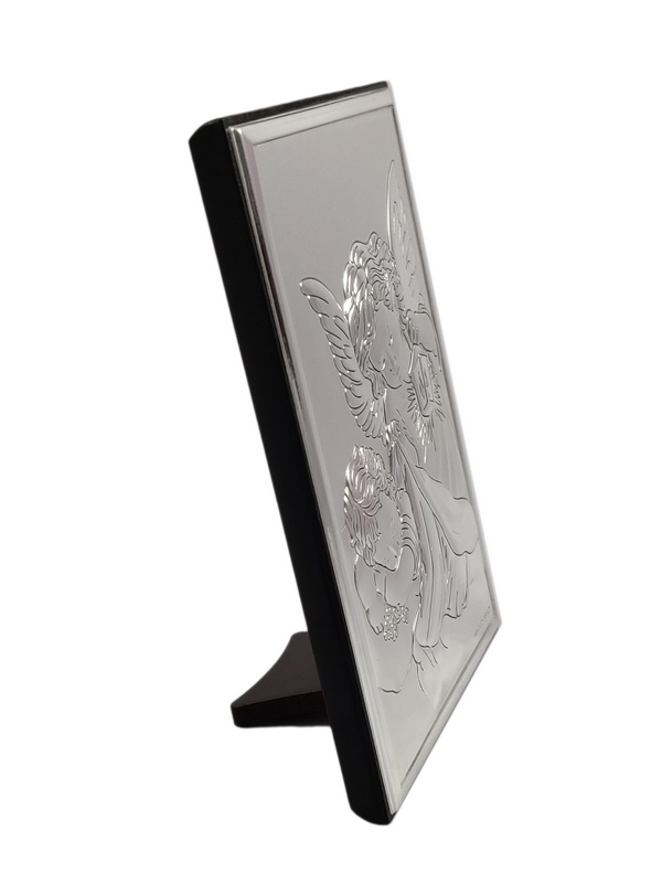 Pamiątka z okazji Chrztu Świętego w formie srebrnego obrazka z Aniołkiem nad dzieckiem w prostokątnym kształcie z grawerem.