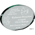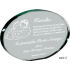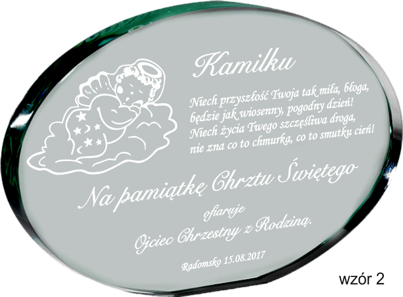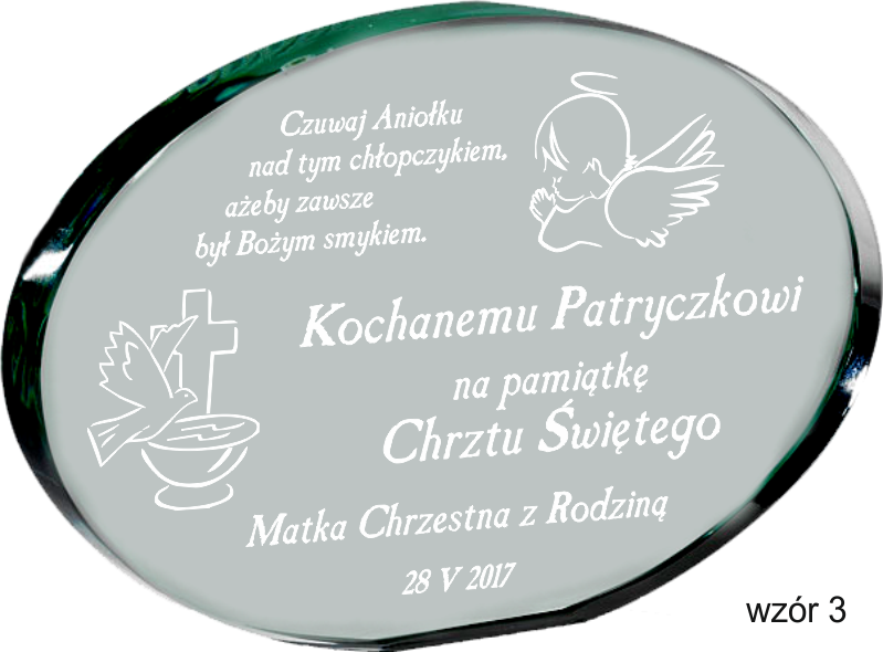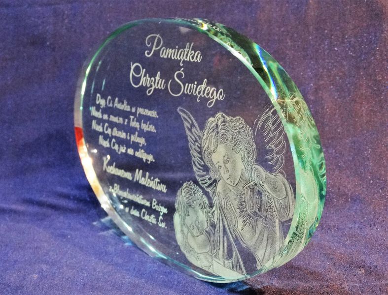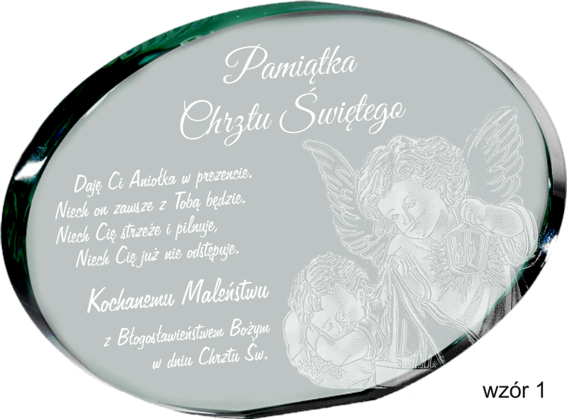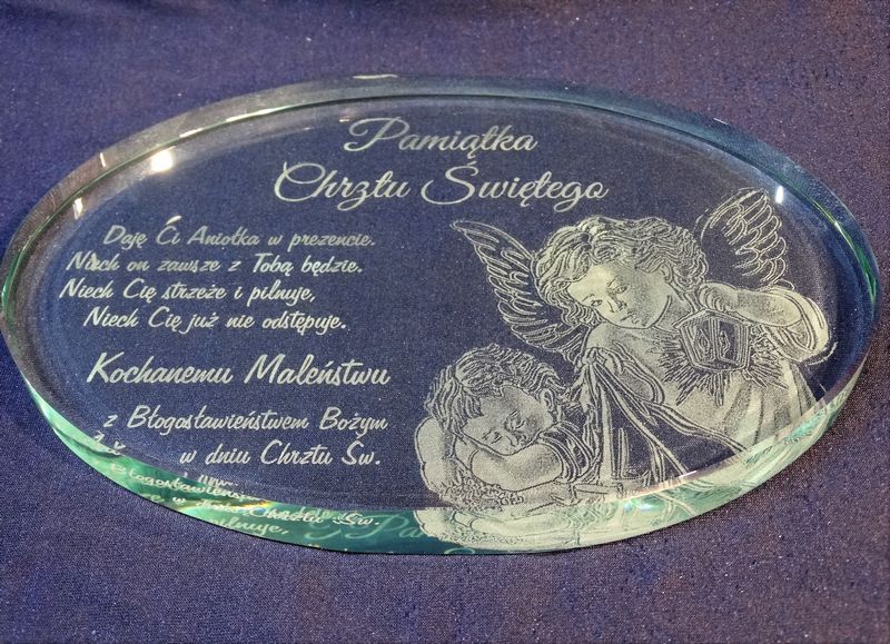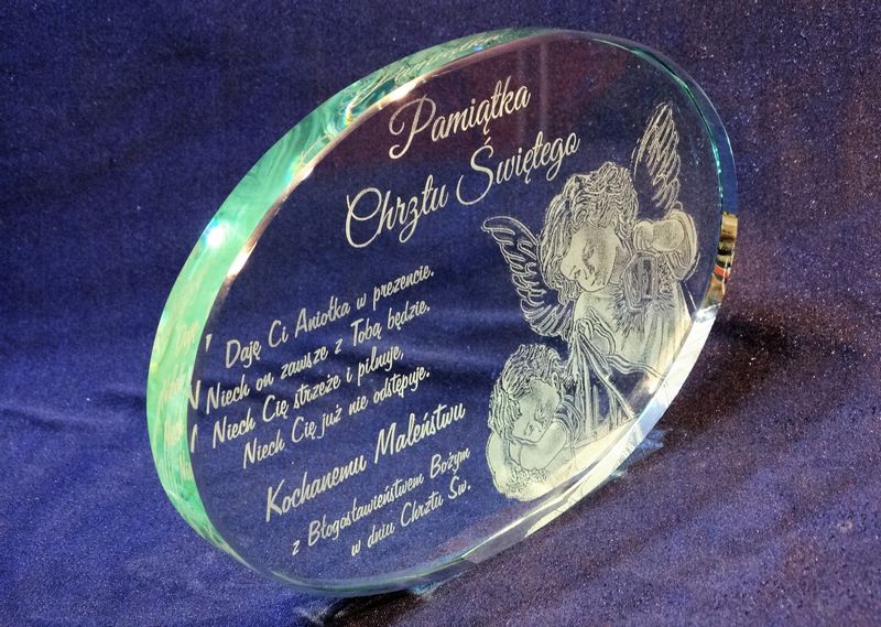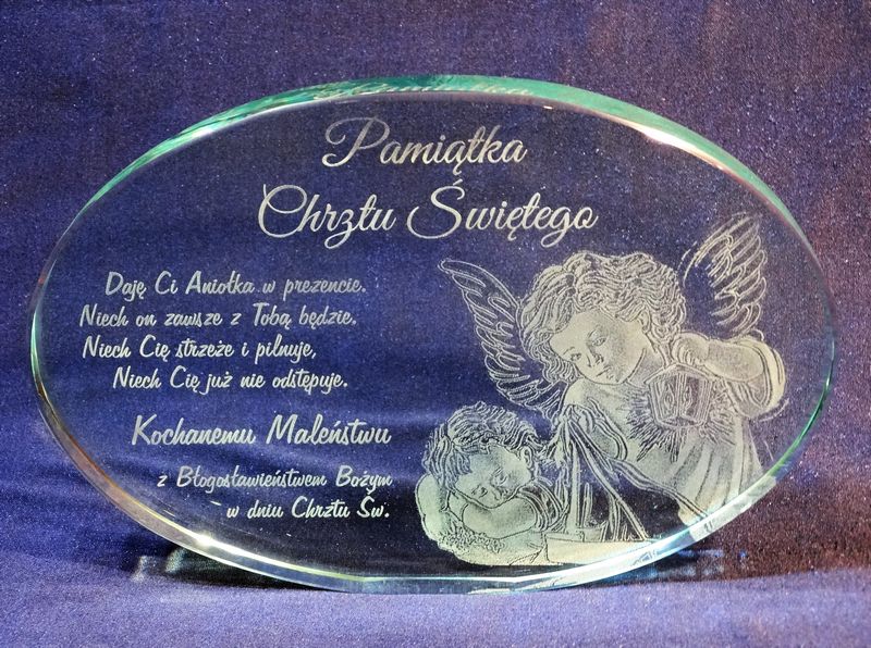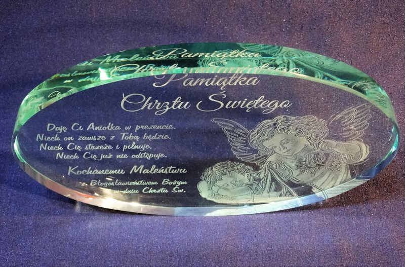 Statuetka szklana eliptyczna z grubego szkła z grawerem dedykacji i ozdobnych grafik z okazji Chrztu Świętego.