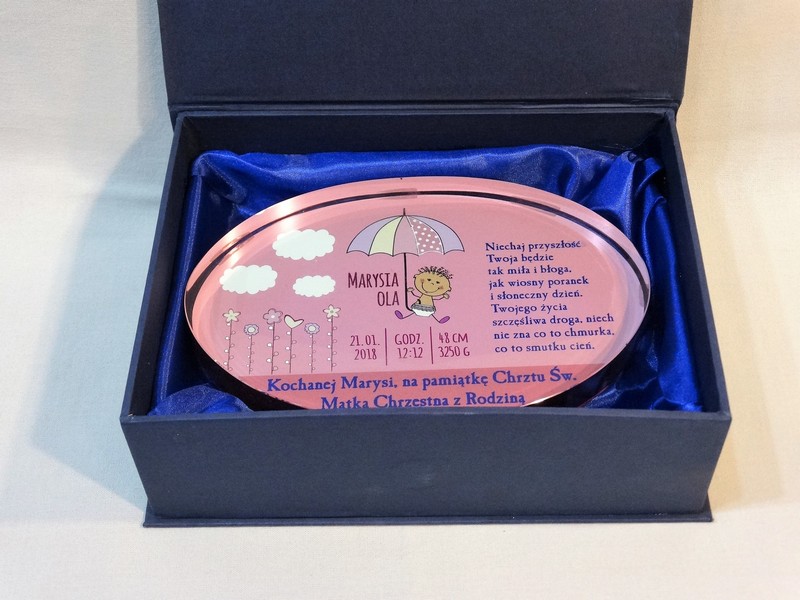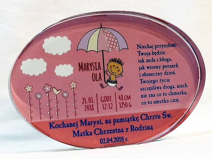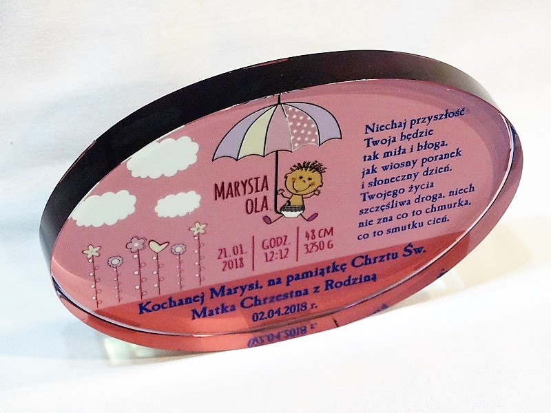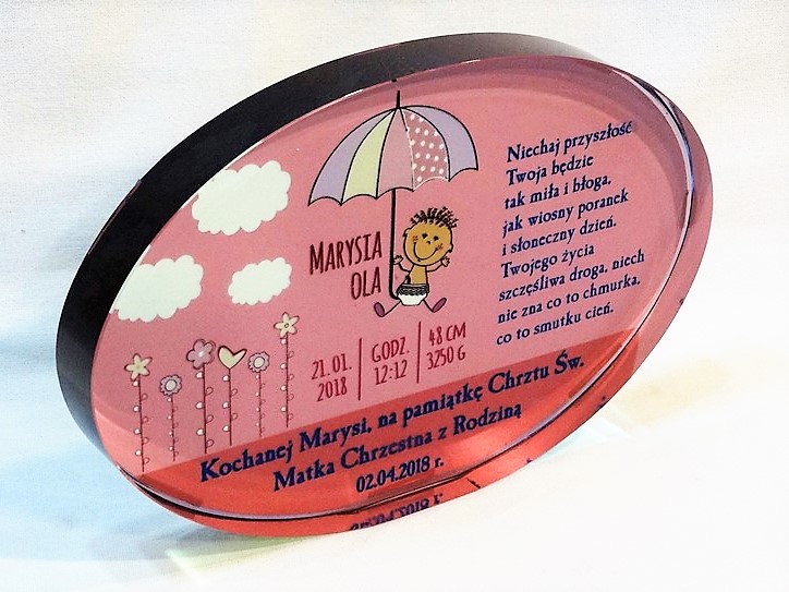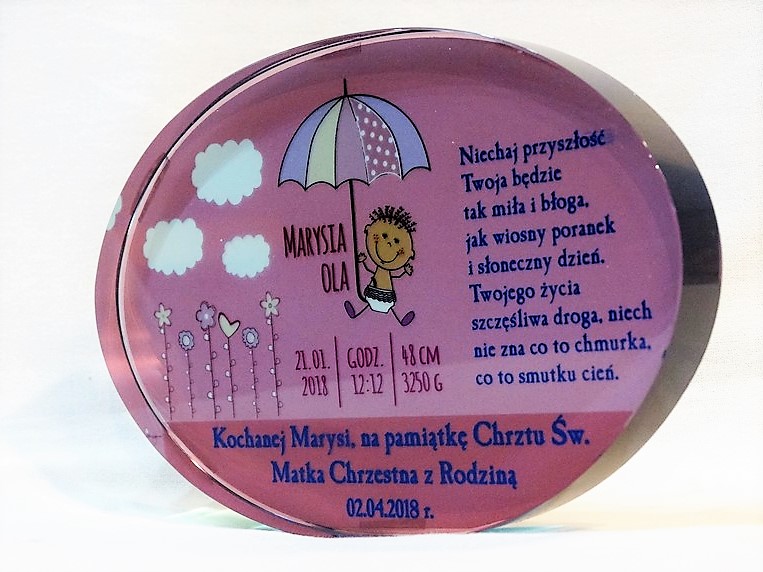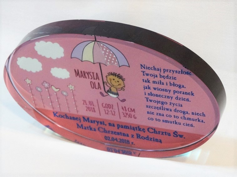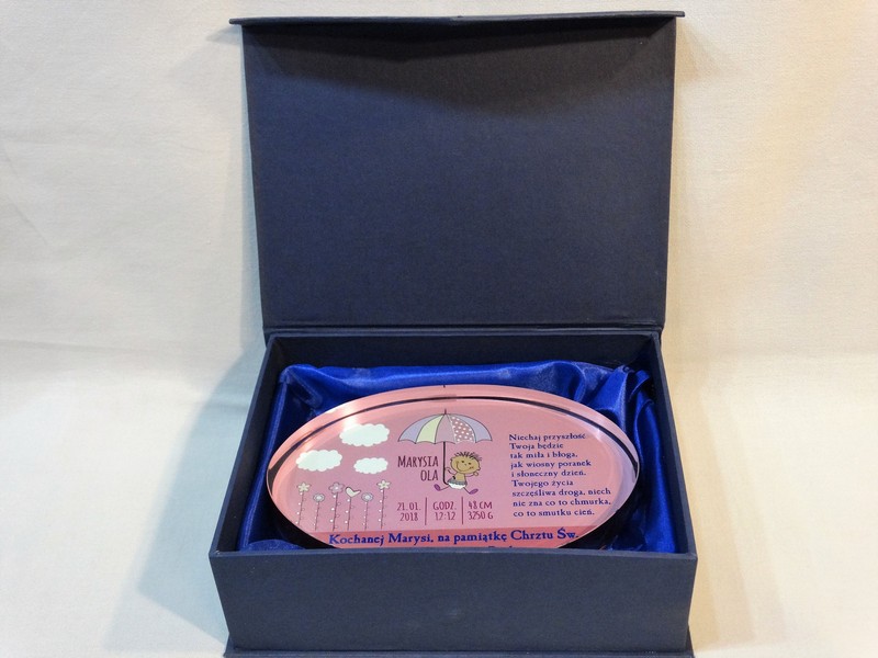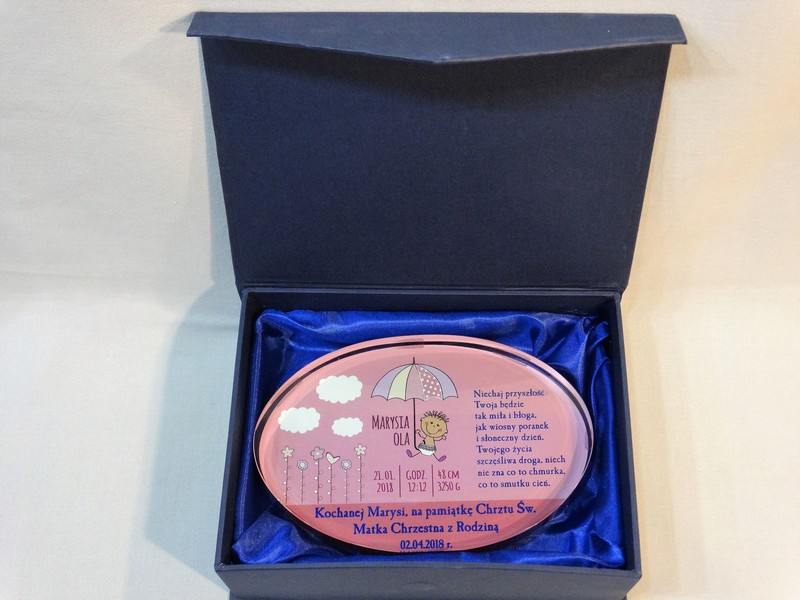 Statuetka szklana eliptyczna z grubego szkła z nadrukiem dedykacji i ozdobnych grafik z okazji Chrztu Świętego.