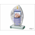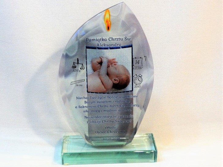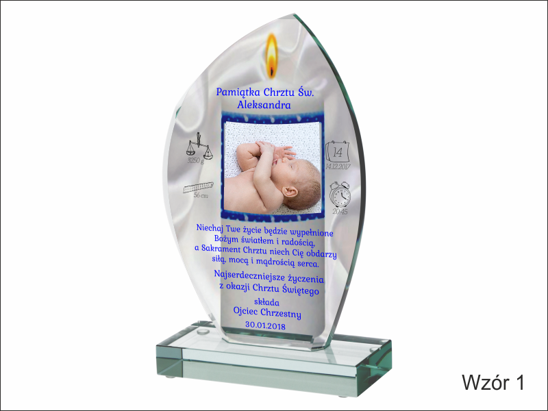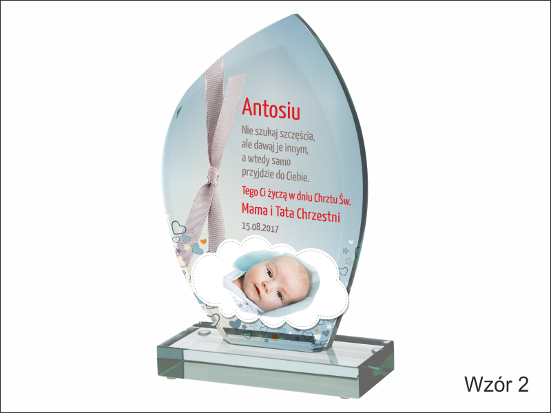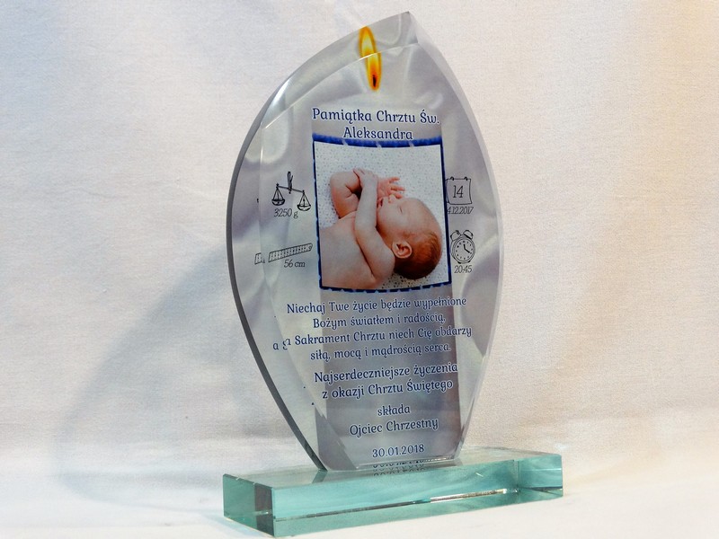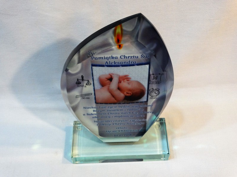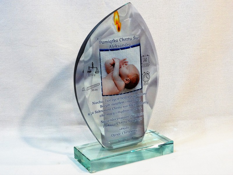 Statuetka szklana z grubego szkła w kształcie szlifowanego żagla z nadrukiem dedykacji i ozdobnych grafik z okazji Chrztu Świętego.