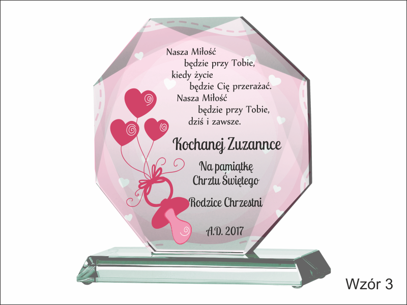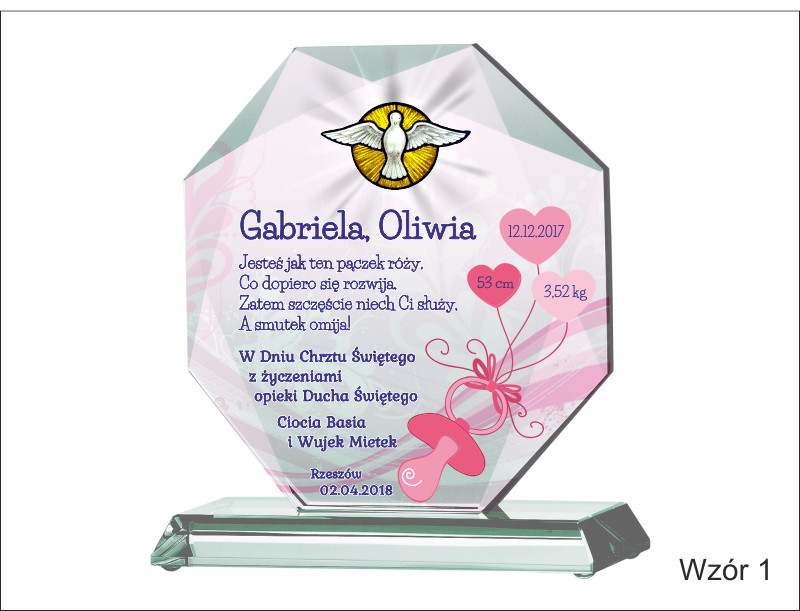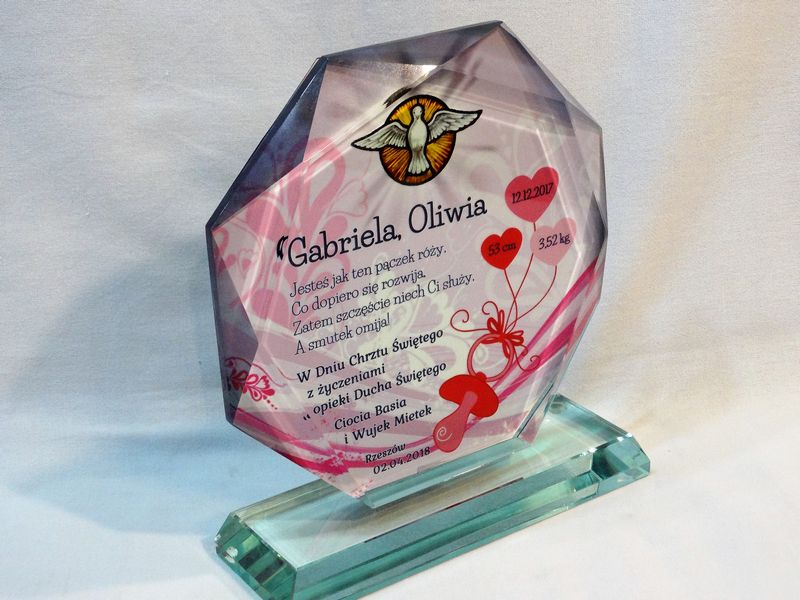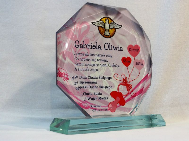 Statuetka szklana z grubego szkła w kształcie szlifowanego ośmioboku z nadrukiem dedykacji i ozdobnych grafik z okazji Chrztu Świętego.