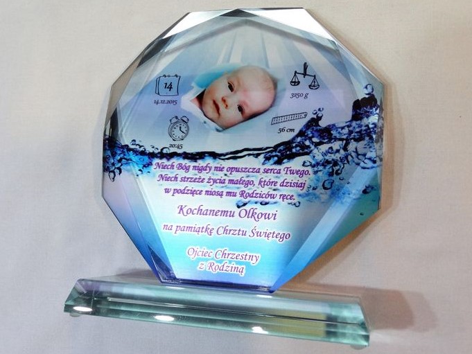 Statuetka szklana z grubego szkła w kształcie szlifowanego ośmioboku z nadrukiem dedykacji i ozdobnych grafik z okazji Chrztu Świętego.