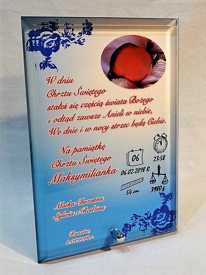 Statuetka szklana z grubego szkła w prostokątnym pionowym kształcie z nadrukiem dedykacji i ozdobnych grafik z okazji Chrztu Świętego.