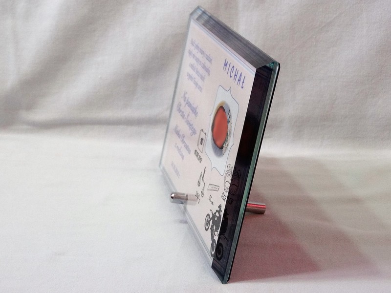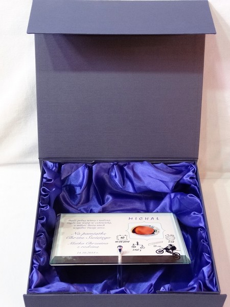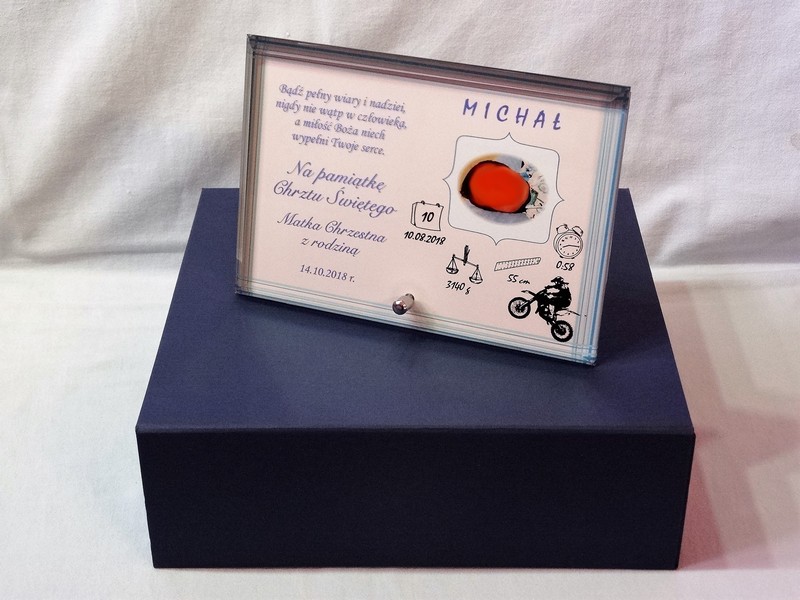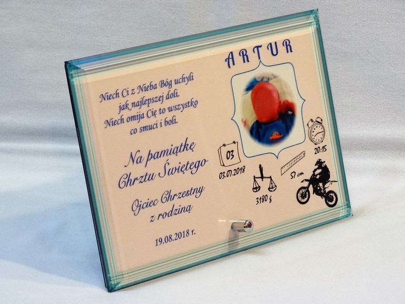 Statuetka szklana z grubego szkła w prostokątnym poziomym kształcie z nadrukiem dedykacji i ozdobnych grafik z okazji Chrztu Świętego.