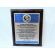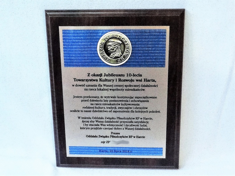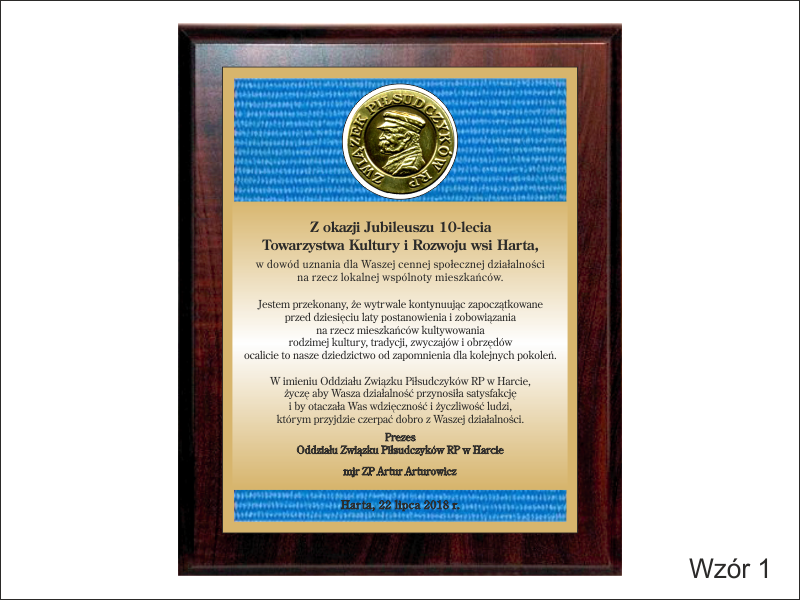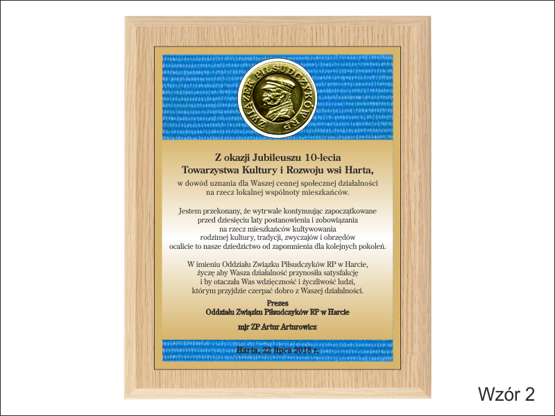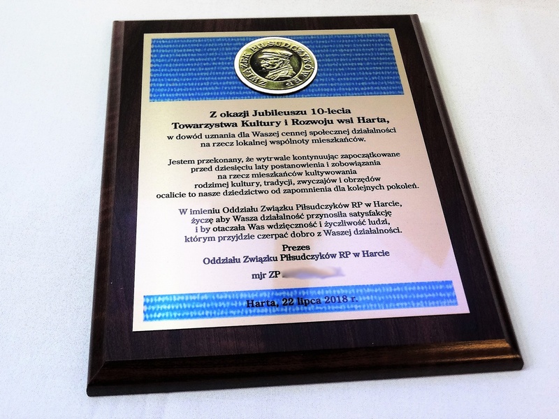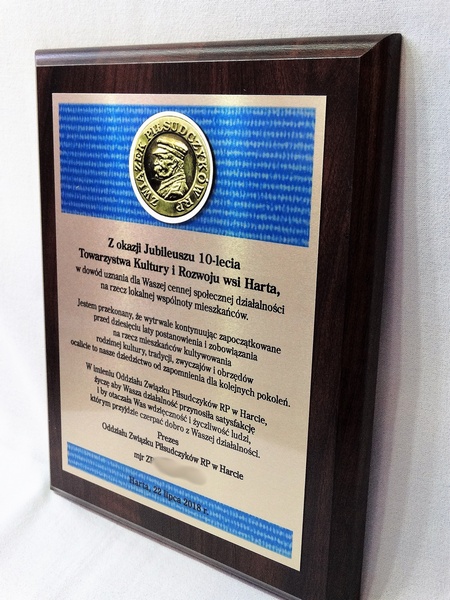 Drewniany dyplom pamiątkowy z okazji jubileuszu działalności stowarzyszenia na drewnianym podkładzie z blachą z nadrukiem.