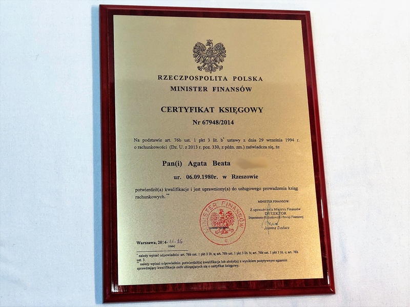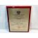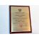 Certyfikat odtworzony jest wg oficjalnego wzoru na złotej blaszce umieszczonej na lakierowanym wiśniowym podkładzie.