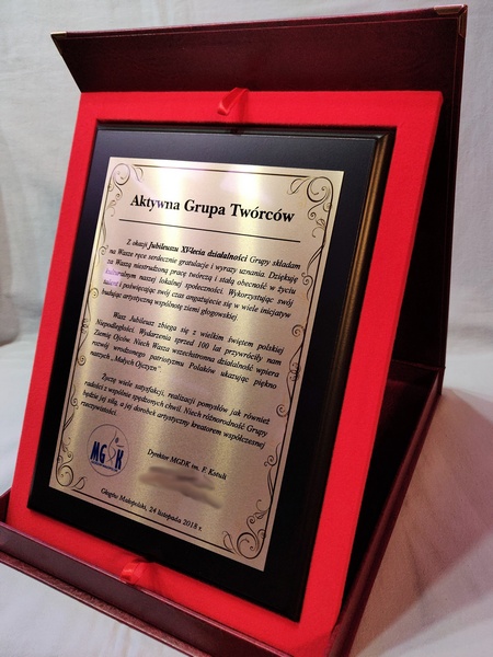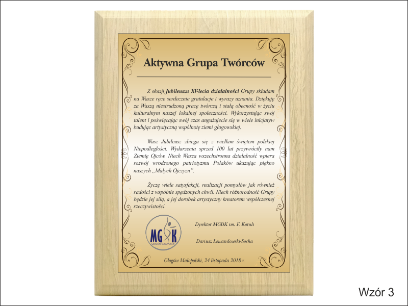 Dyplom drewniany na lakierowanym podkładzie z nadrukowaną blachą z okazji jubileuszu funkcjonowania stowarzyszenia.