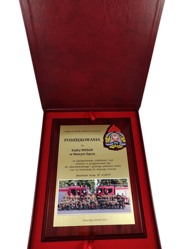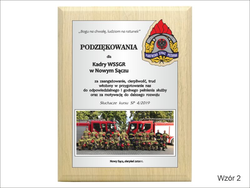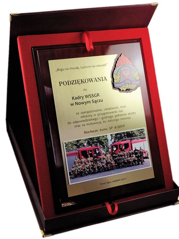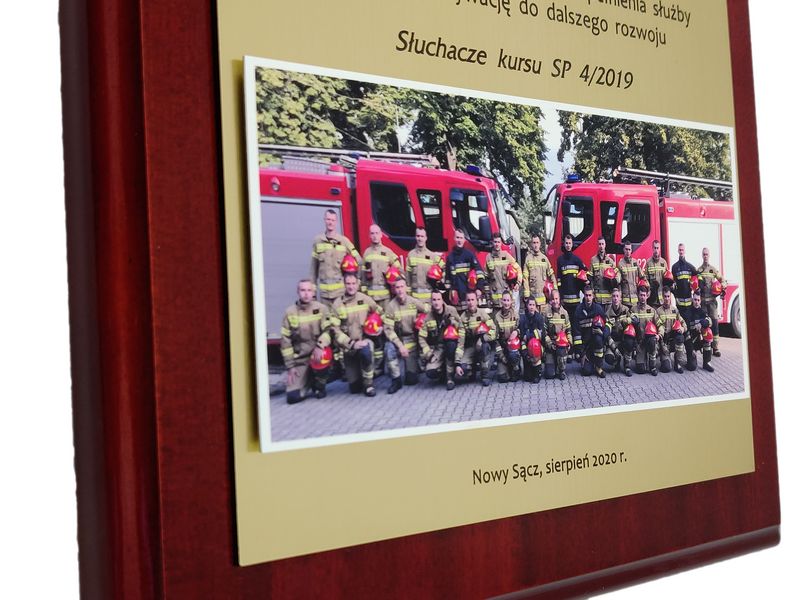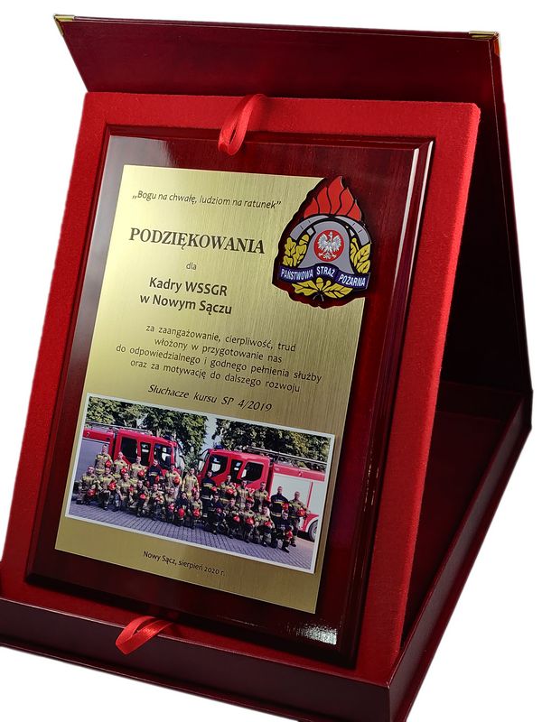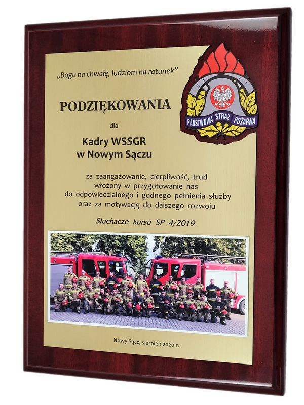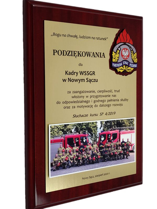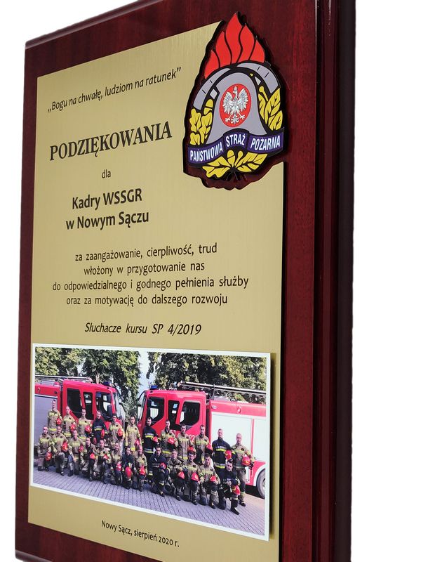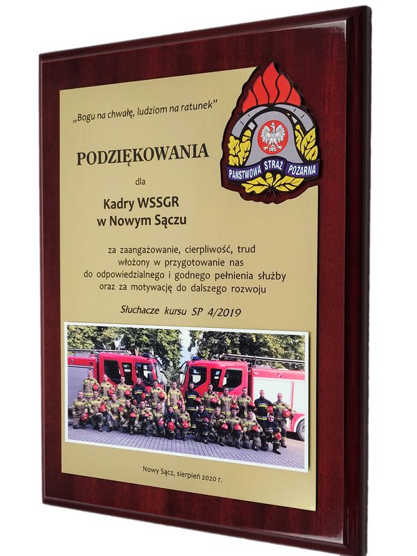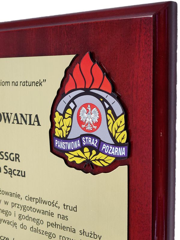 Dyplom drewniany złożony na lakierowanym podkładzie - podziękowanie od straży pożarnej.