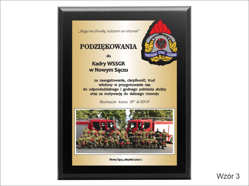 - z laminatu z wygrawerowaną dedykacją i podciętym miejscem na odznakę,