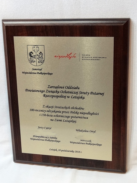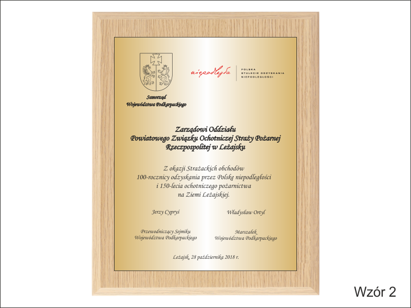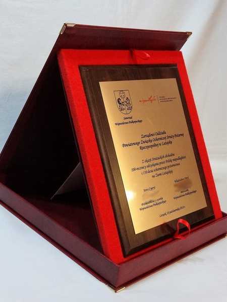 Dedykacja, grafiki, herby nadrukowane są.na blaszce w złotym, srebrnym lub brązowym odcieniu.