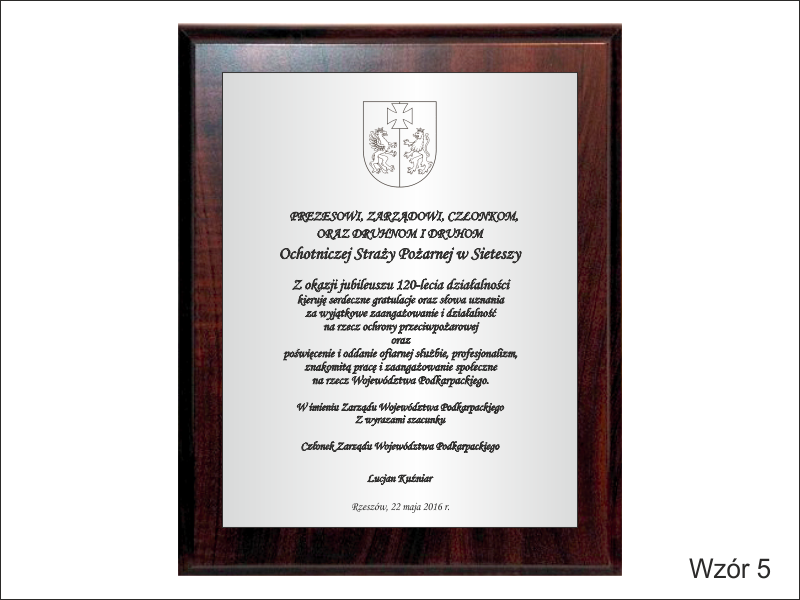 Dyplom drewniany w układzie pionowym na różne oficjalne i formalne urzędowe okazje składający się z blachy z nadrukiem i standardowego podkładu.
