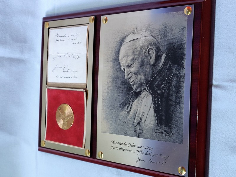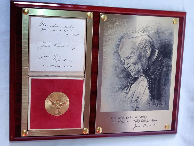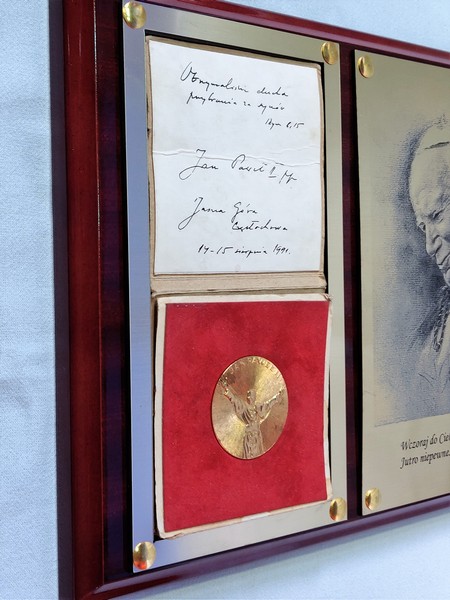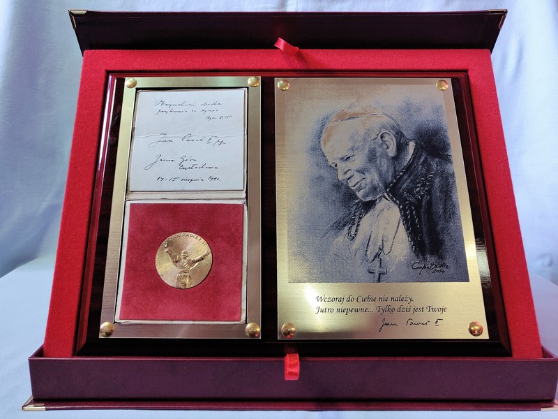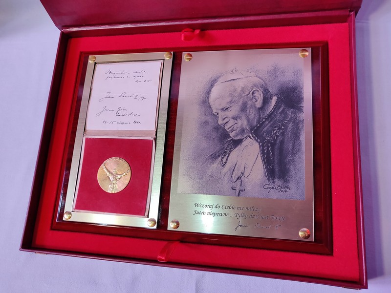 Dodatkowo w celu podkreślenia okazji z jakiej medal został wykonany oraz osoby, z którą medal jest związany obok medalu na złotym laminacie wykonano grawer zdjęcia Jana Pawła II i cytatu naszego wielkiego rodaka.