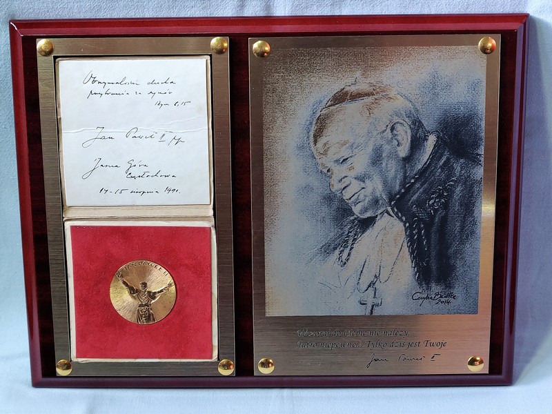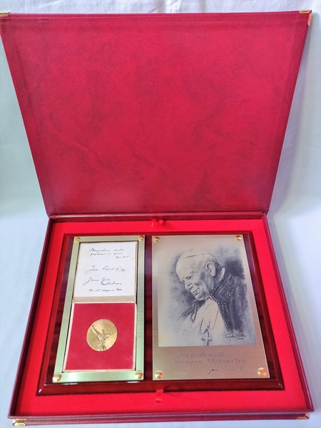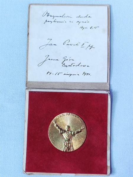 W prezentowanym przykładzie medal został dostarczony w oryginalnym kartonowym pudełku z odręczną dedykacją Jana Pawła II.